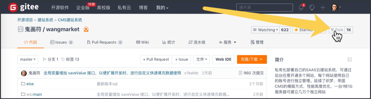 在大多数情况下,你想参与别人的开源项目进行贡献时,可以Fork这个仓库。Fork后就会克隆出一个自己的仓库来。所有的修改都在克隆后自己的这个仓库,也就是自己的仓库中进行修改。需要注意的事,每次更改功能前,要同步一下自己克隆的仓库,保证自己仓库代码是最新的。改动完成后,提交一个合并请求到主仓库进行申请合并。