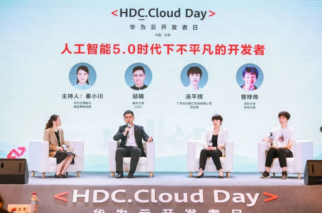 在本次活动的圆桌对话上,华为云赋能云高级营销经理秦小川、蜗牛工场CEO邱楠、广东光达智汇科技有限公司总经理、华为云HCDE汤平辉,与深圳大学学生开发者曾梓烨,共同探讨人工智能5.0时代下开发者的面临的挑战和新机遇。