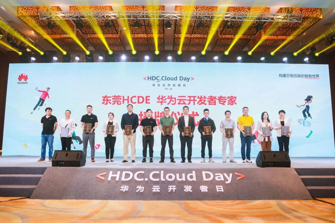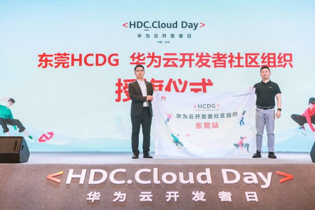 在主论坛的最后,也邀请到了华为云东莞本地的HCDE(华为云开发者技术专家计划),现场为新加入的成员颁发专家证书,并为其成员授予HCDG(华为云开发者社区组织)旗帜。
