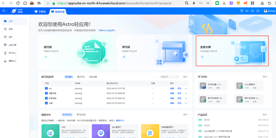 打开Astro导航界面,https://appcube.cn-north-4.huaweicloud.cn/lowcode/home.html#/projects;选择快速搭建业务大屏;