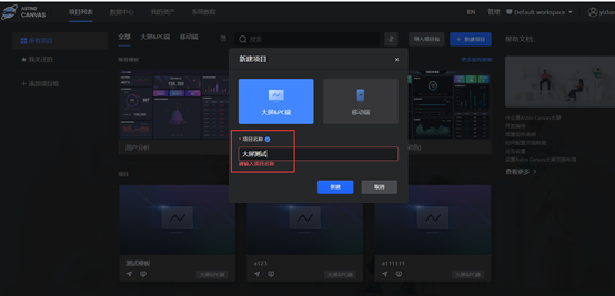 出现如下界面,选择大屏&PC端,输入项目名称,此处写为大屏测试;