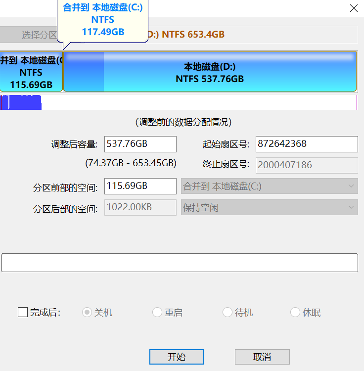 通过左右拉如图所示的分界线进行盘容量的选择,也可手动输入容量,点击开始,耐心等待,程序会自动运行。