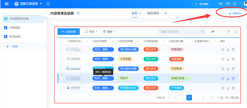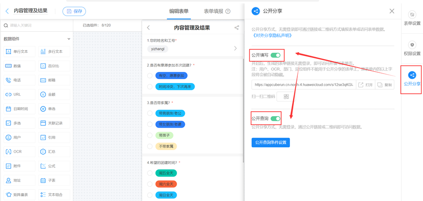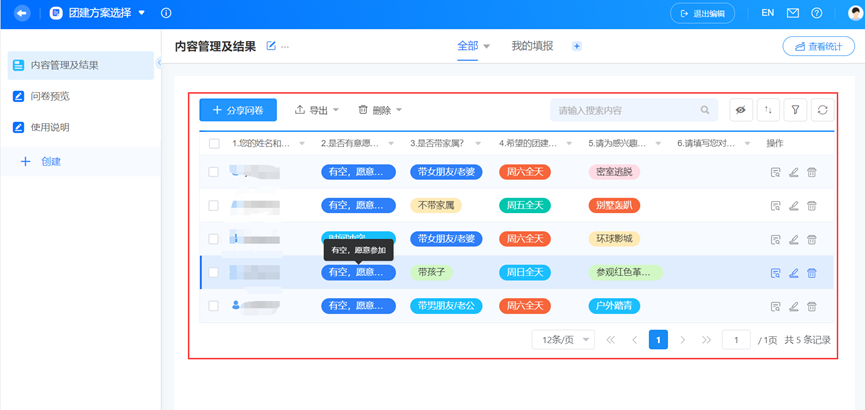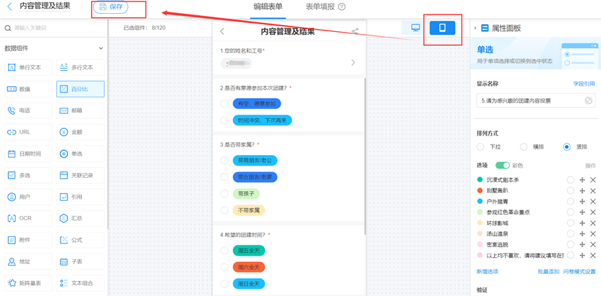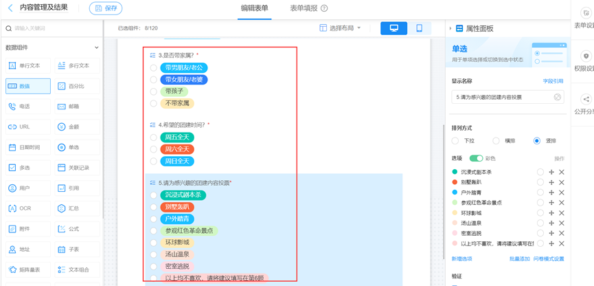 根据公司团建需要,依次增加表单填写内容,同时可为表单编辑并选择颜色,如下图;