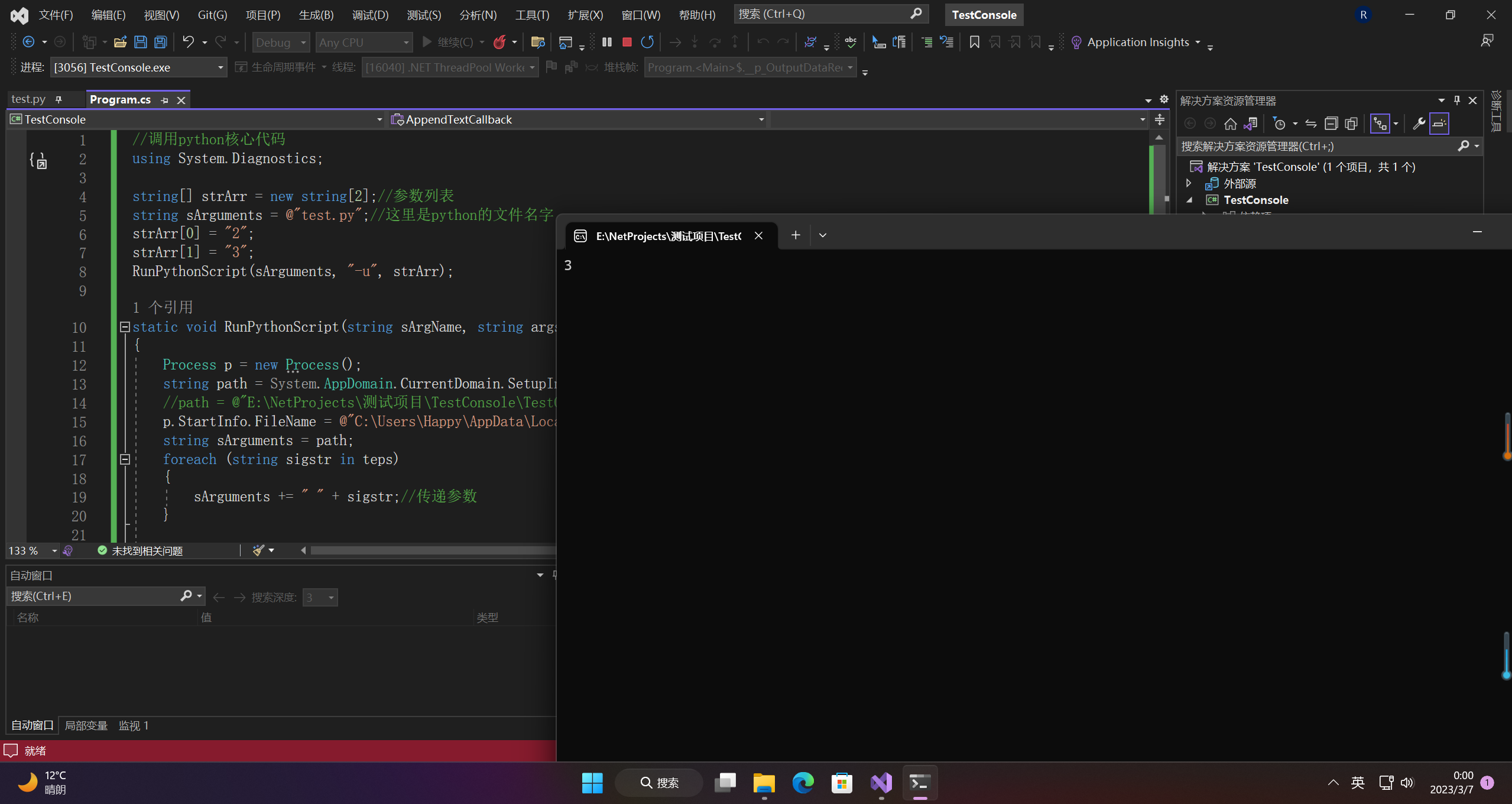string sArguments = @"test.py";//这里是python的文件名字