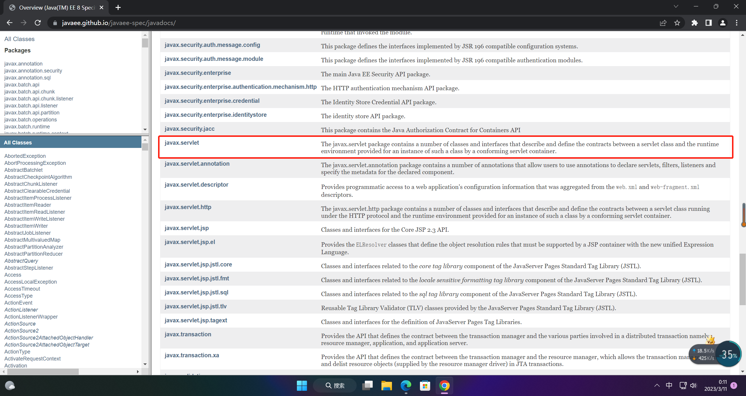 打开官方API网址,在左上部分找到javax.servlet包,在左下部分找到Servlet,如下图显示: