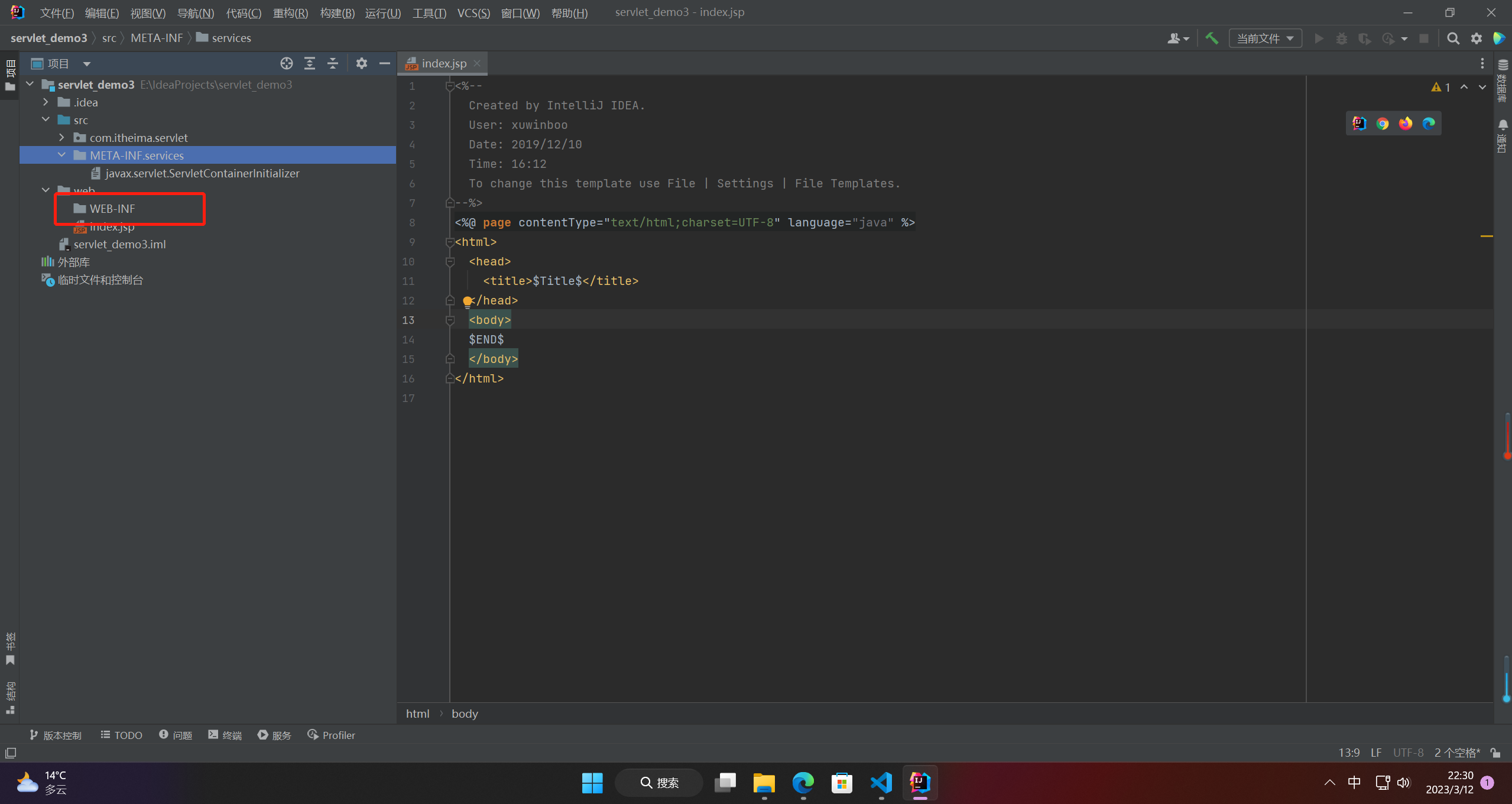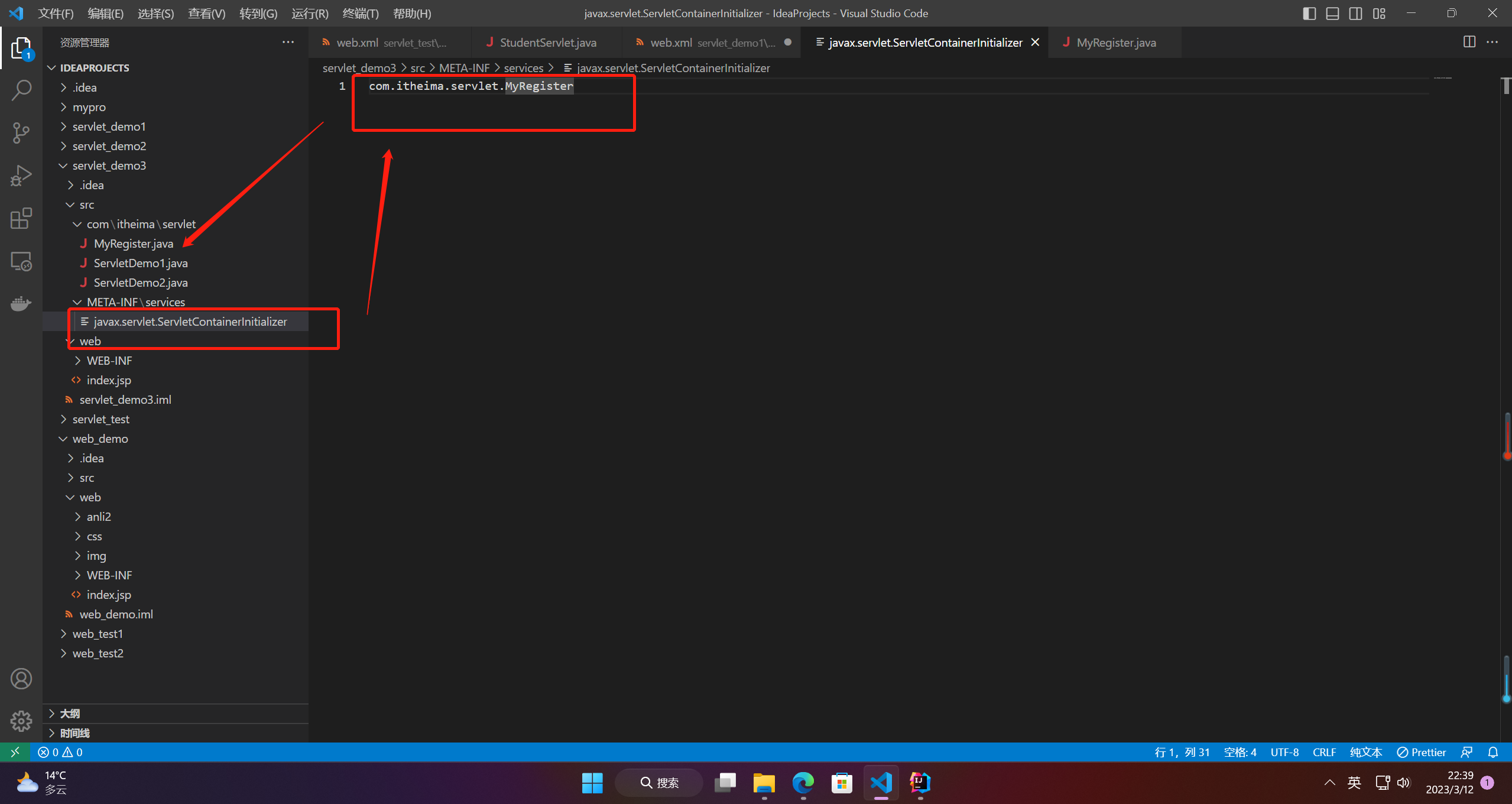 在脱离web.xml时,要求在src目录下包含一个META-INF目录,位置和及字母都不能改变,且严格区分大小写。在目录中创建一个名称为javax.servlet.ServletContainerInitializer的文件,里面写实现了ServletContainerInitializer接口的全限定类名。如下图所示: