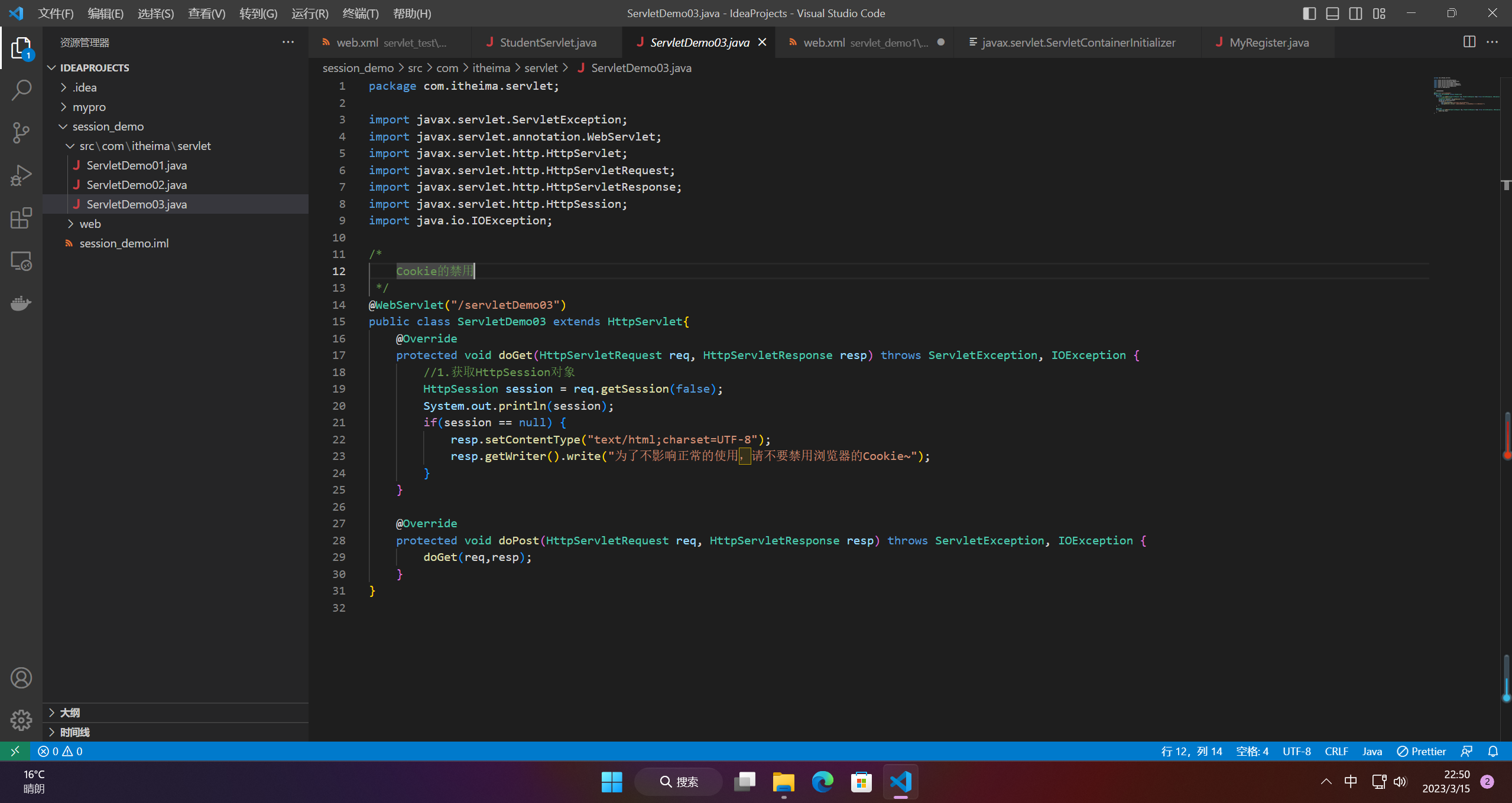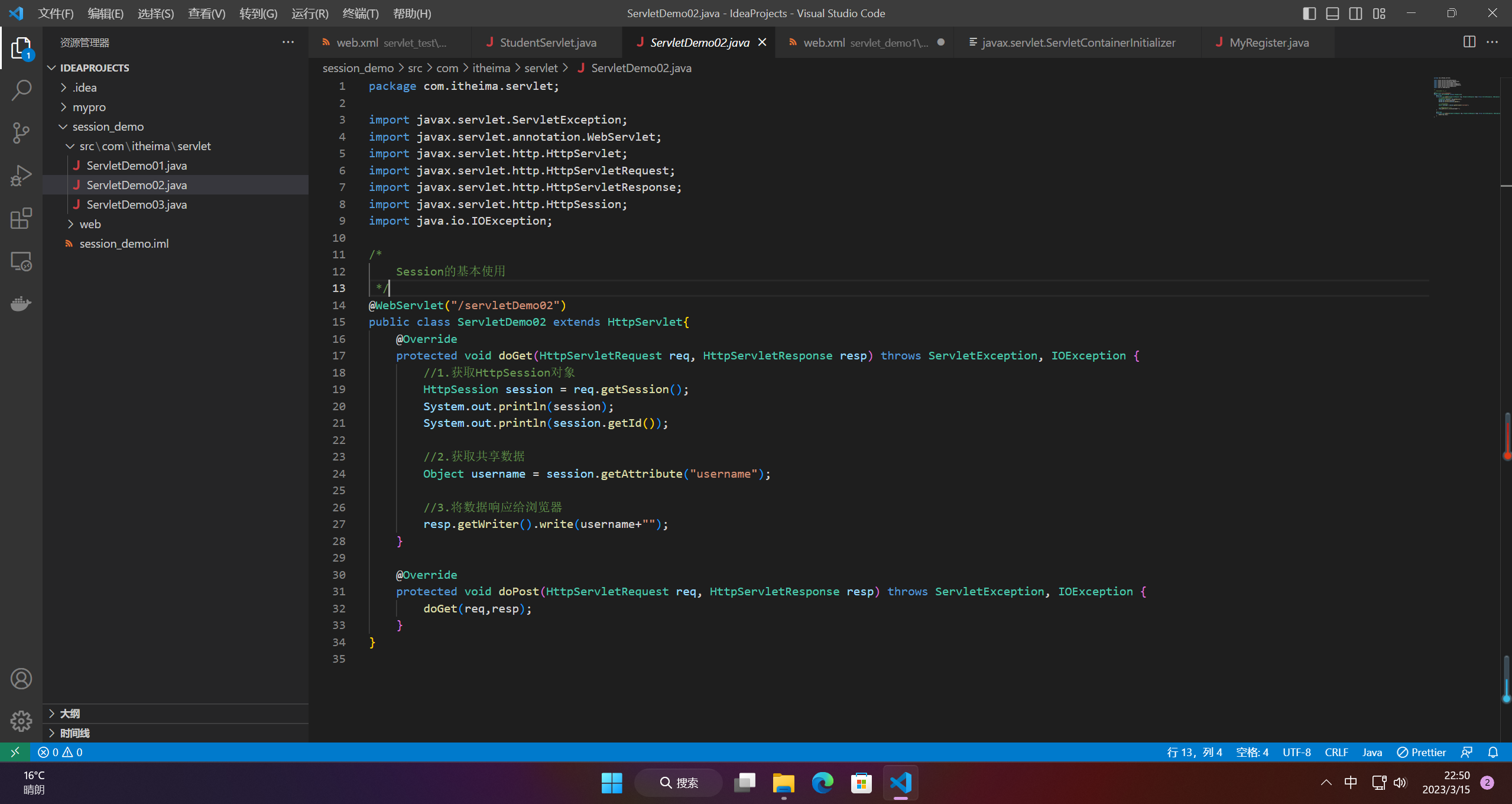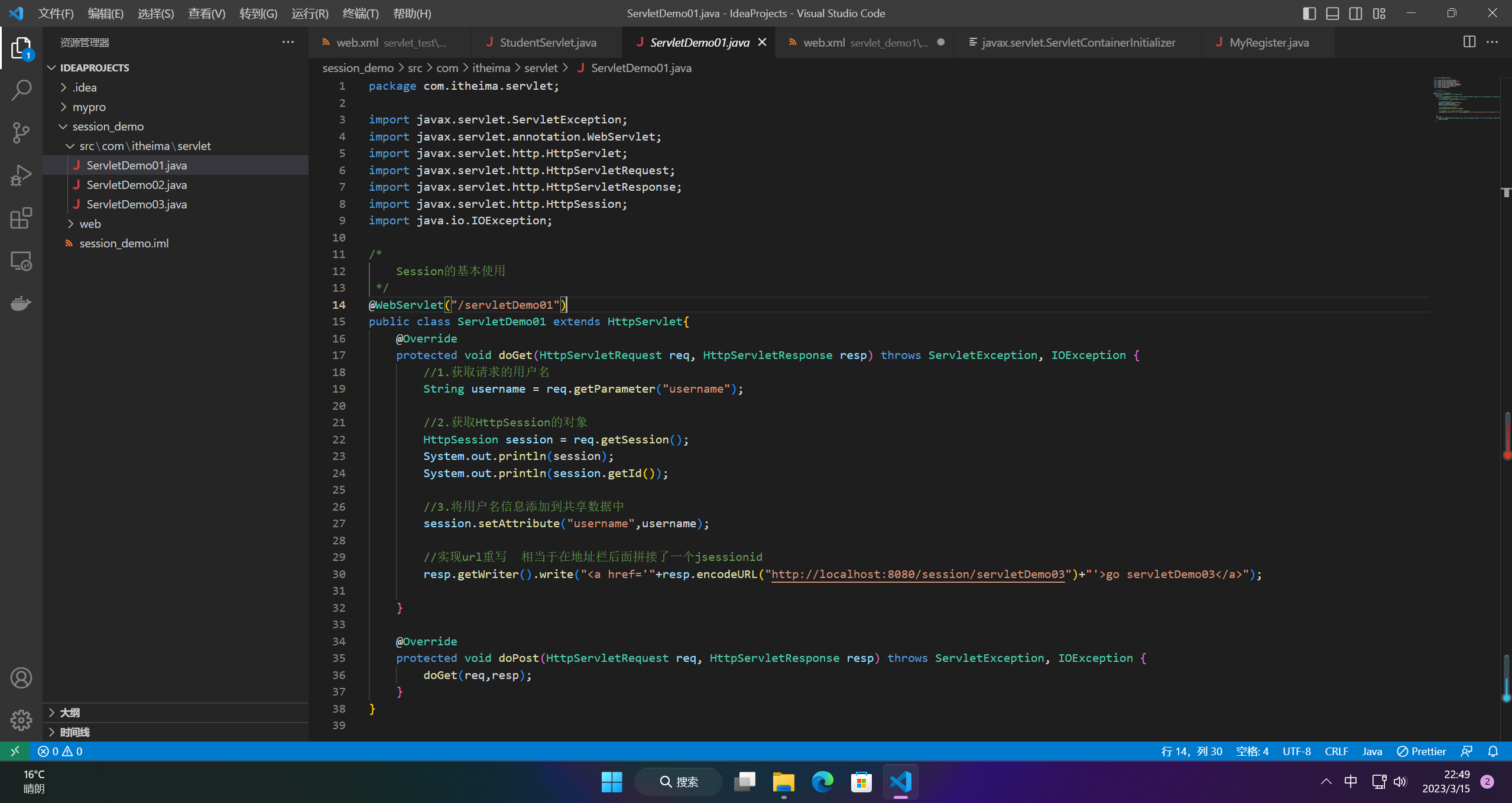 在请求HttpSessionDemo1这个Servlet时,携带用户名信息,并且把信息保存到会话域中,然后从HttpSessionDemo2这个Servlet中获取登录信息。