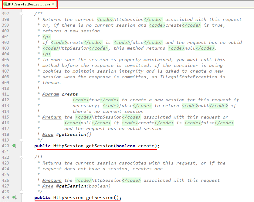 获取HttpSession是通过HttpServletRequest接口中的两个方法获取的,如下图所示: