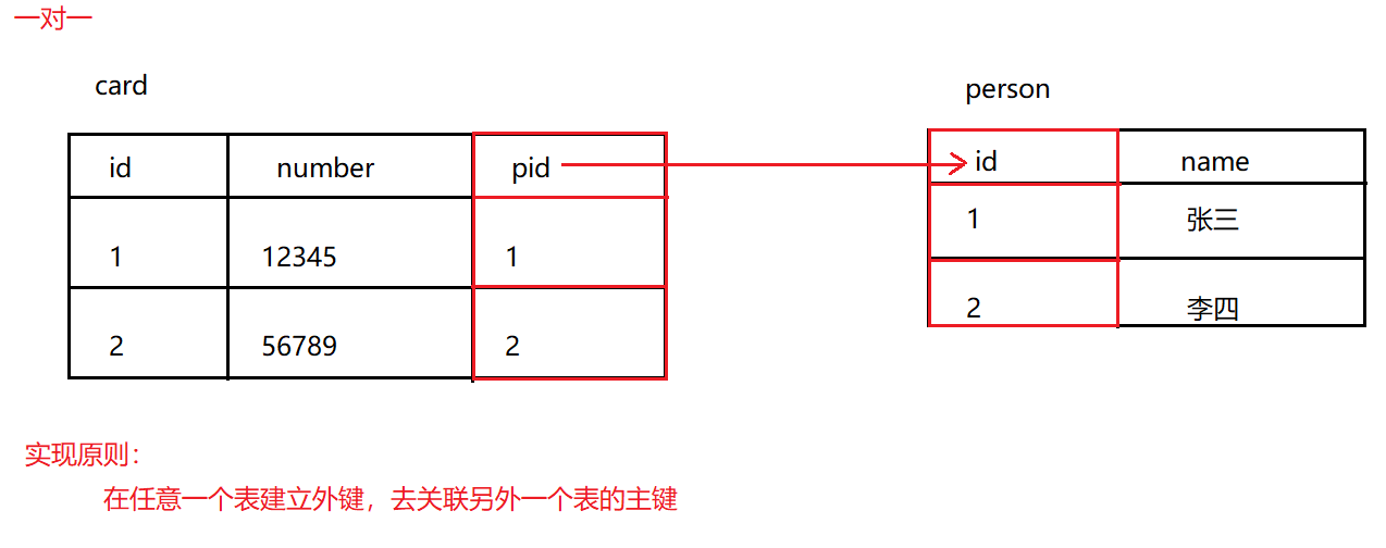 – 在任意一个表建立外键,去关联另外一个表的主键