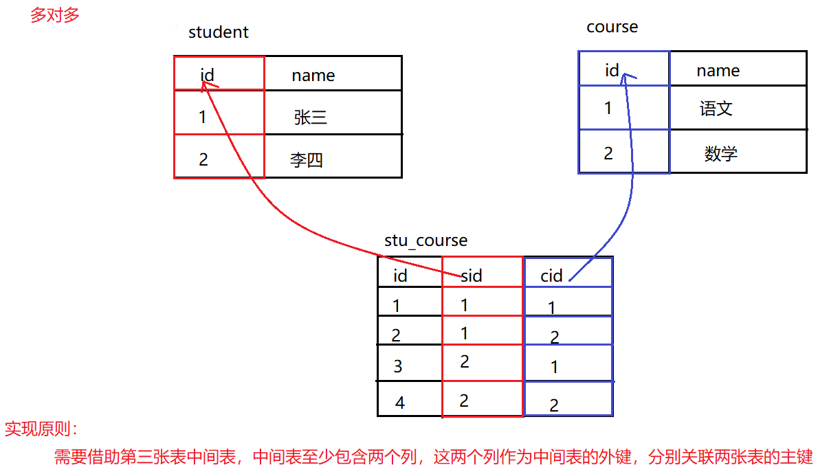 – 需要借助第三张表中间表,中间表至少包含两个列,这两个列作为中间表的外键,分别关联两张表的主键