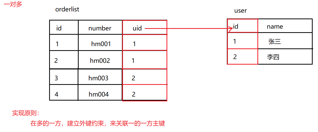 – 在多的一方,建立外键约束,来关联一的一方主键