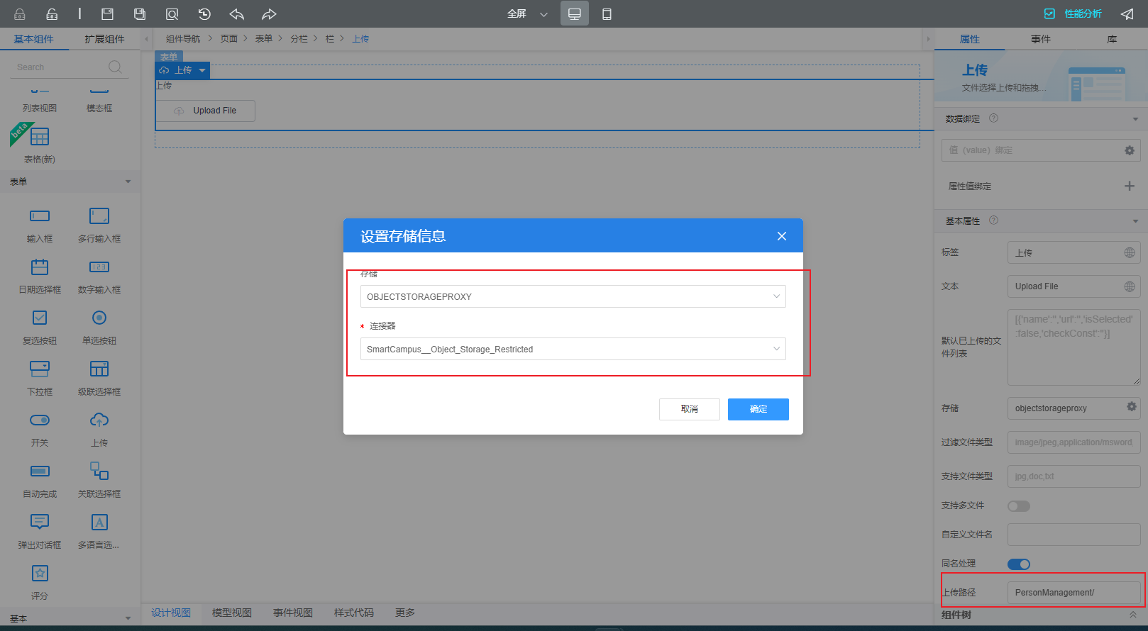 步骤如下:新建一个标准页面,拖上传组件,配置如下: