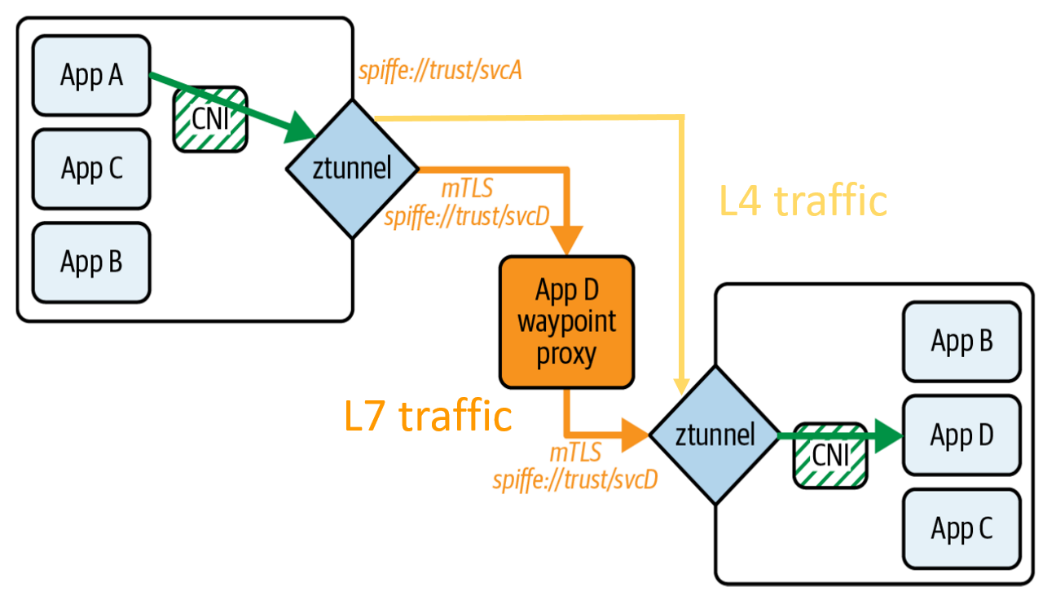6. 如果目标服务配置了waypoint(利用特殊配置的Gateway对象)以及L7的处理策略,则源端ztunnel会和对应的waypoint建立mTLS,waypoint终止mTLS后,进行L7的逻辑处理,之后再与目标Pod所在节点的ztunnel建立mTLS,最终同样由目的端的ztunnel终止mTLS并将流量发往目标Pod。