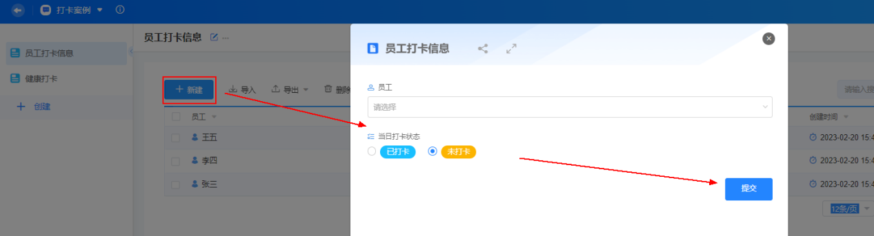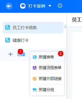 (1)完成上边的操作后,我们在“员工打卡信息”表单,新建测试数据。