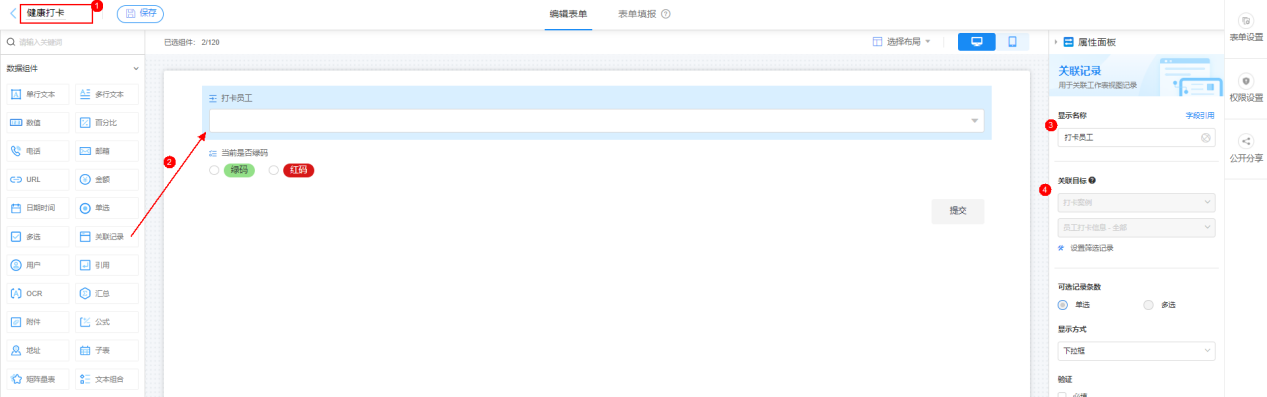 6、设置表单名称为“健康打卡”,拖拽“关联记录”组件到画布上,设置显示名称为“打卡员工”。