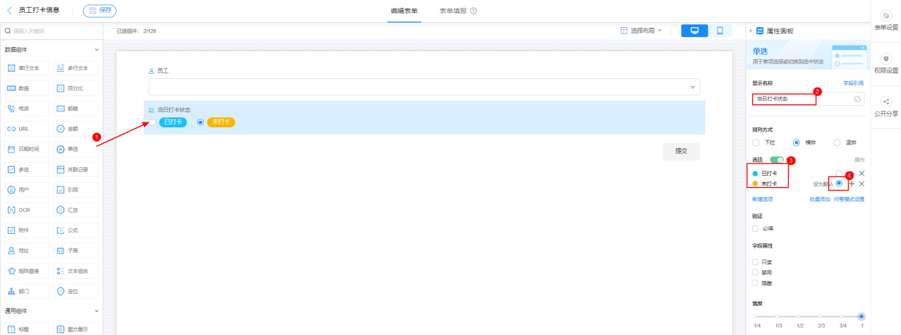 在右侧的属性中,修改名称为“每日打卡状态”,设置两个选项的名称分别为“已打卡”、“未打卡”,“点击”下图位置4(将状态默认值设置为未打卡,右侧圈圈)。完成以上两个组件的配置后,点击“保存”,点击“退出”。