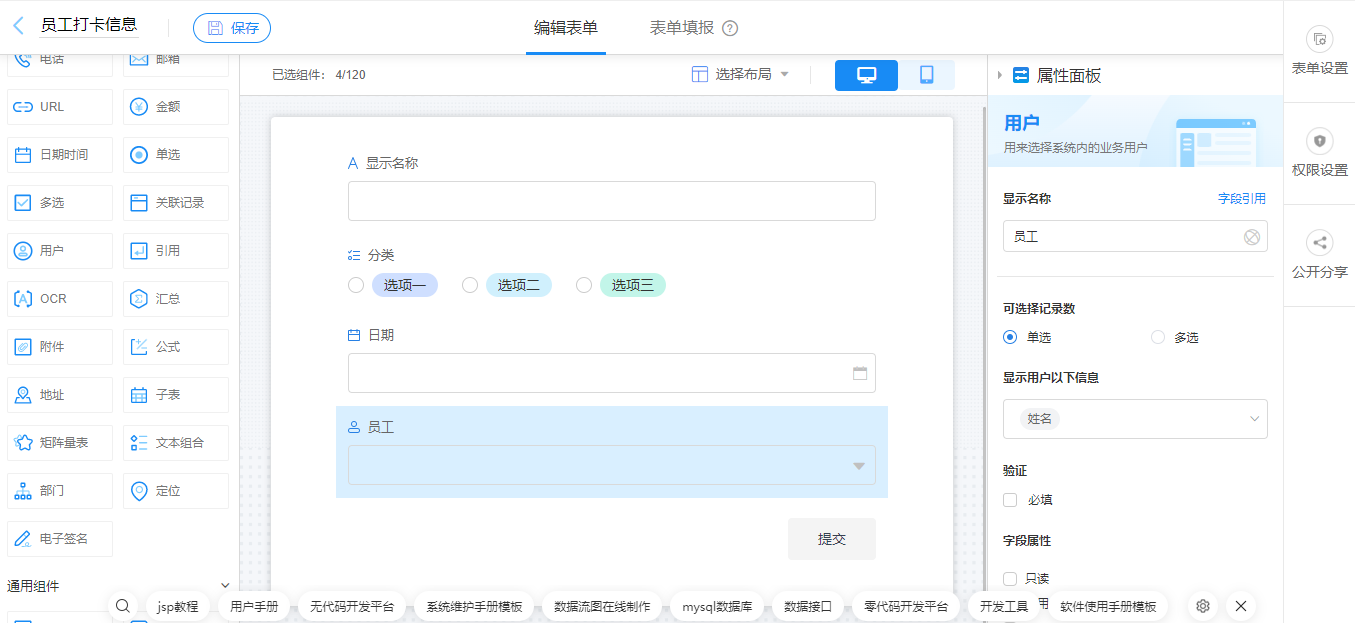 3、在新建的表单中,为表单命名“员工打卡信息”,拖拽“用户”组件到右侧画布,将组件名称改为“员工”。