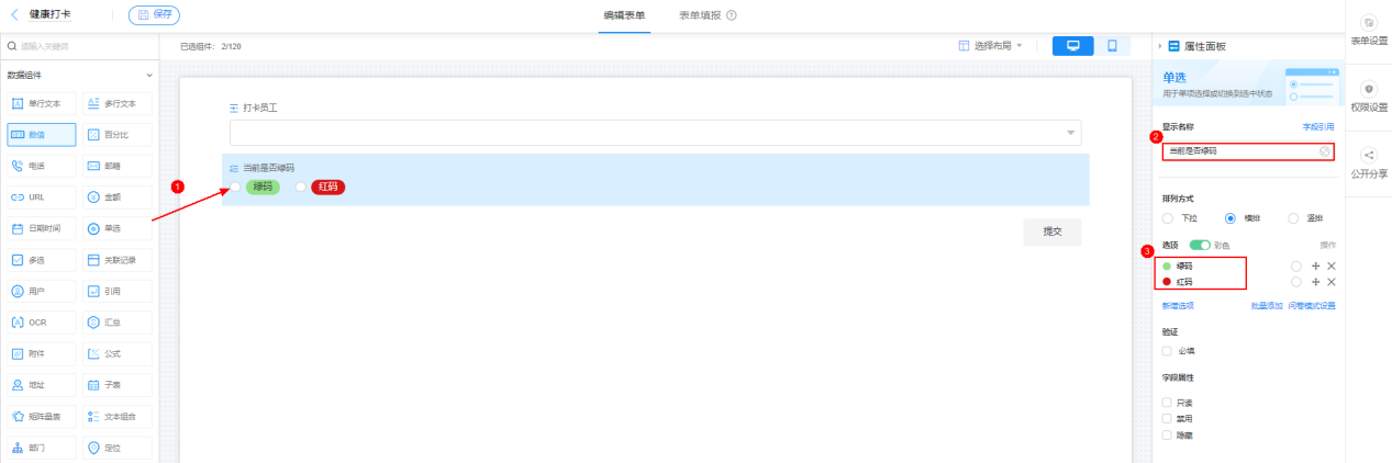 点击右侧关联目标中的所示下拉框,选择“员工打卡信息”选项,选择视图选择“全部”选项。拖拽“单选”组件到画布上,设置名称为“当前是否绿码”,设置选项分别为“绿码”、“红码”,勾选“必填”选项。完成以上两个组件的配置后,点击“保存”,点击“退出”。