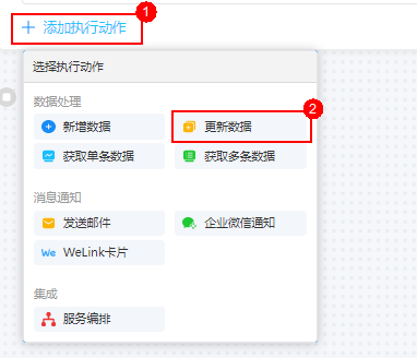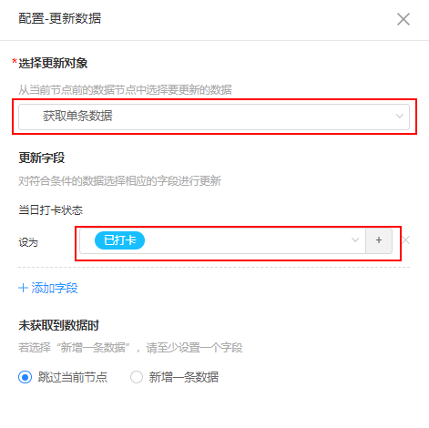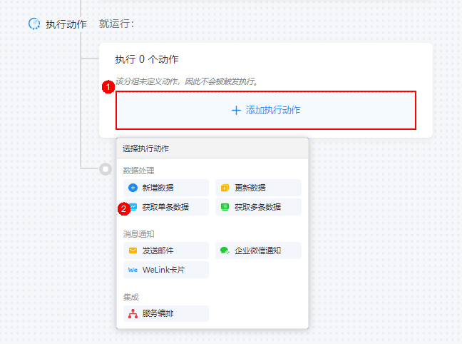 (2)右上角名称设置为“员工打卡后,更改打卡状态”,选择触发器的表单为“健康打卡”。点击添加动作,选择“获取单条数据”。
