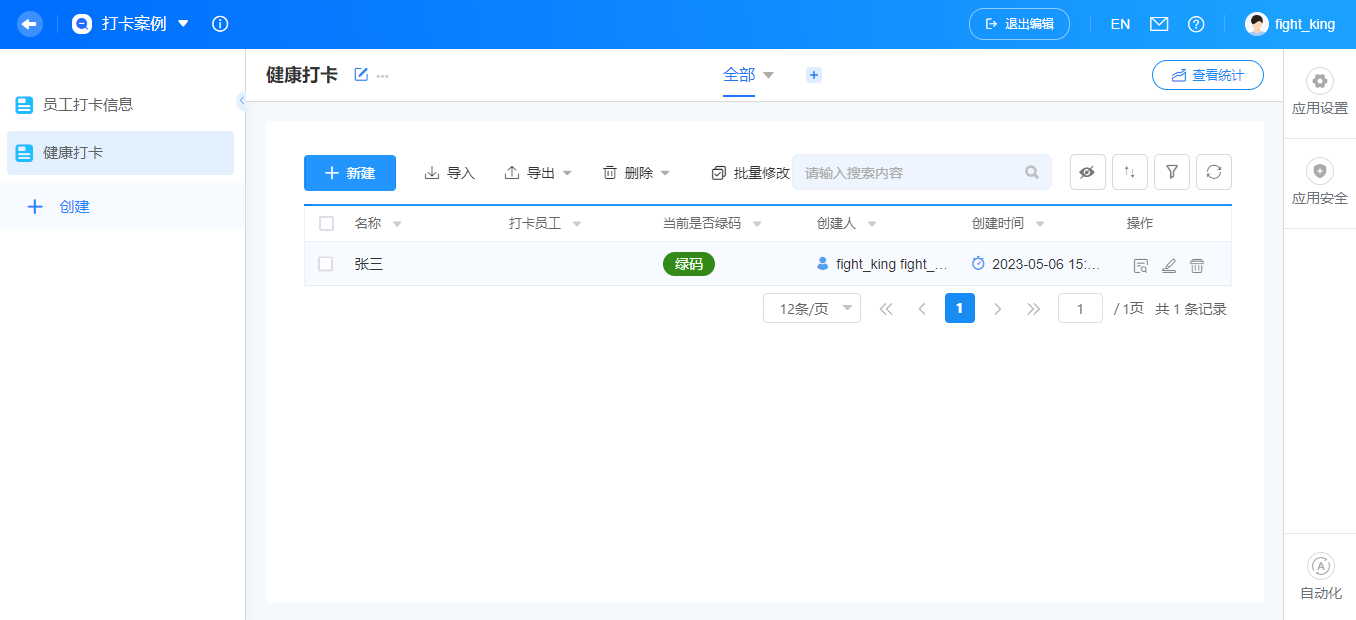 (2)在“健康打卡”表单,提交一条数据,如张三,绿码。提交成功后:提交成功,新增数据一条。