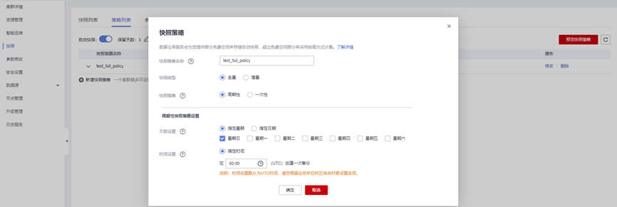 例如:创建一条名称为test_full_policy,每周日的UTC 0点周期性备份的全量快照策略;