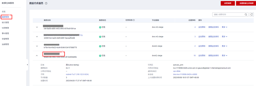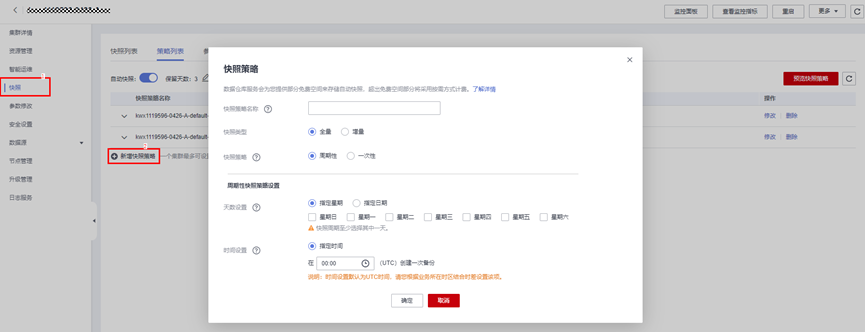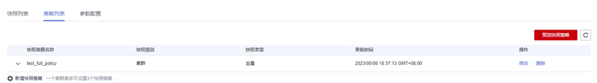 步骤a - 创建快照策略:选中创建的DWS集群,点击集群名字,进入集群详细页;点击“快照”,选择策略列表,点击“新增快照策略”;