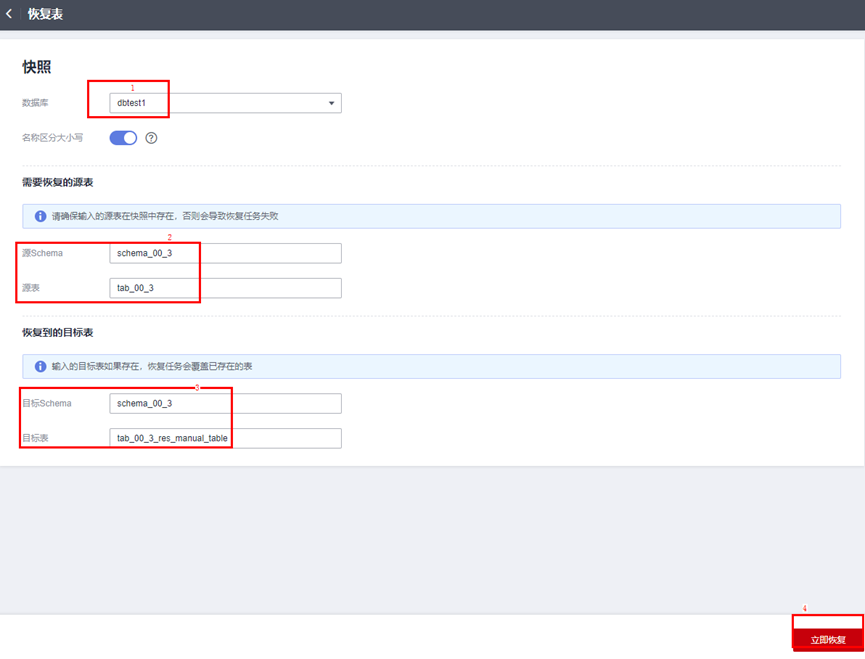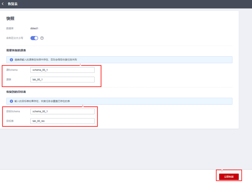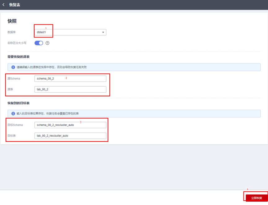步骤d:与集群级自动快照一样,输入数据库,源表和目标表信息后点击“立即恢复”: