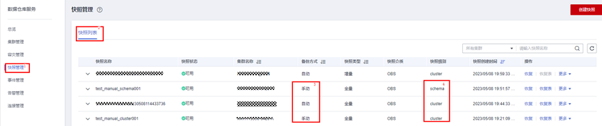 DWS当前支持从自动快照和手动快照进行表恢复,支持矩阵如下: