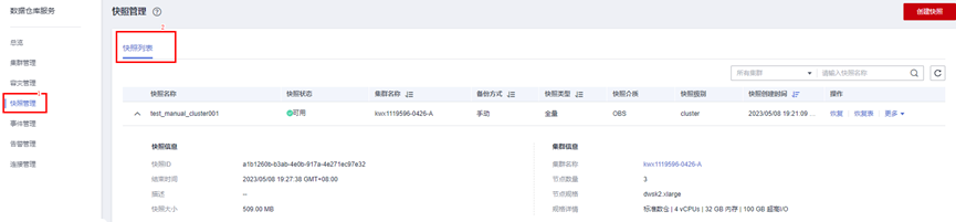 步骤b:创建成功后,快照列表新增命名为“test_manual_cluster001”的快照信息: