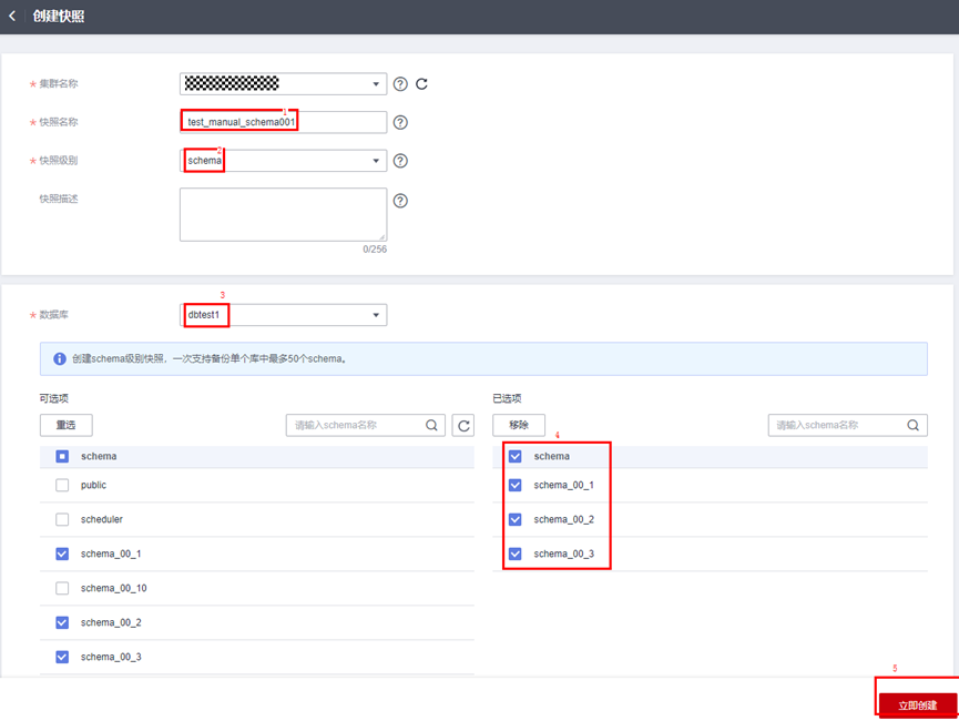 步骤 a:进入“快照管理” 页面,选中业务集群,快照级别选择“schema”,选择待备份schema所在的库,勾选需备份的3个schema,创建快照名称为“test_manual_schema001”的手动schema级快照: