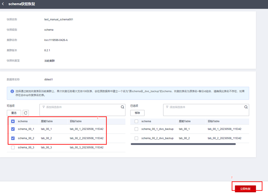 步骤f: 选择误删表schema_00_2.tab_00_2所在的数据库,手动填写源表信息和目标表信息后点击“立即恢复”: