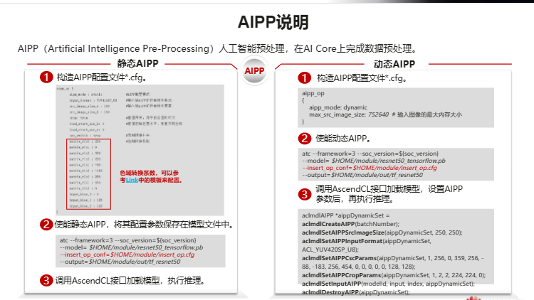 AIPP(Artificial Intelligence Pre-Processing)人工智能预处理,用于在AI Core上完成数据预处理,包括改变图像尺寸、色域转换(转换图像格式)、减均值/乘系数(改变图像像素),数据预处理之后再进行真正的模型推理。