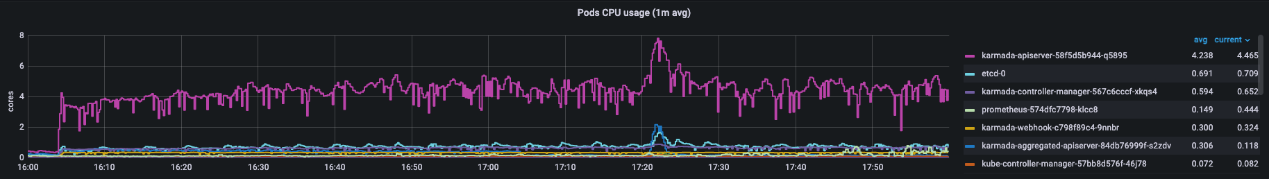 在Pull模式中,控制面的资源消耗主要集中在karmada-apiserver,而不是karmada-controller-manager。