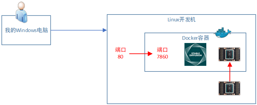 所以docker启动会带2个额外的参数:(1)挂载GPU卡。(2)设置端口映射