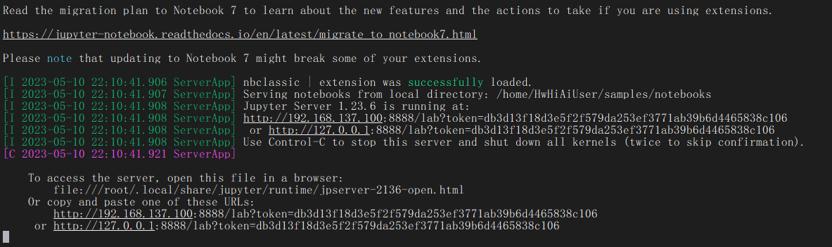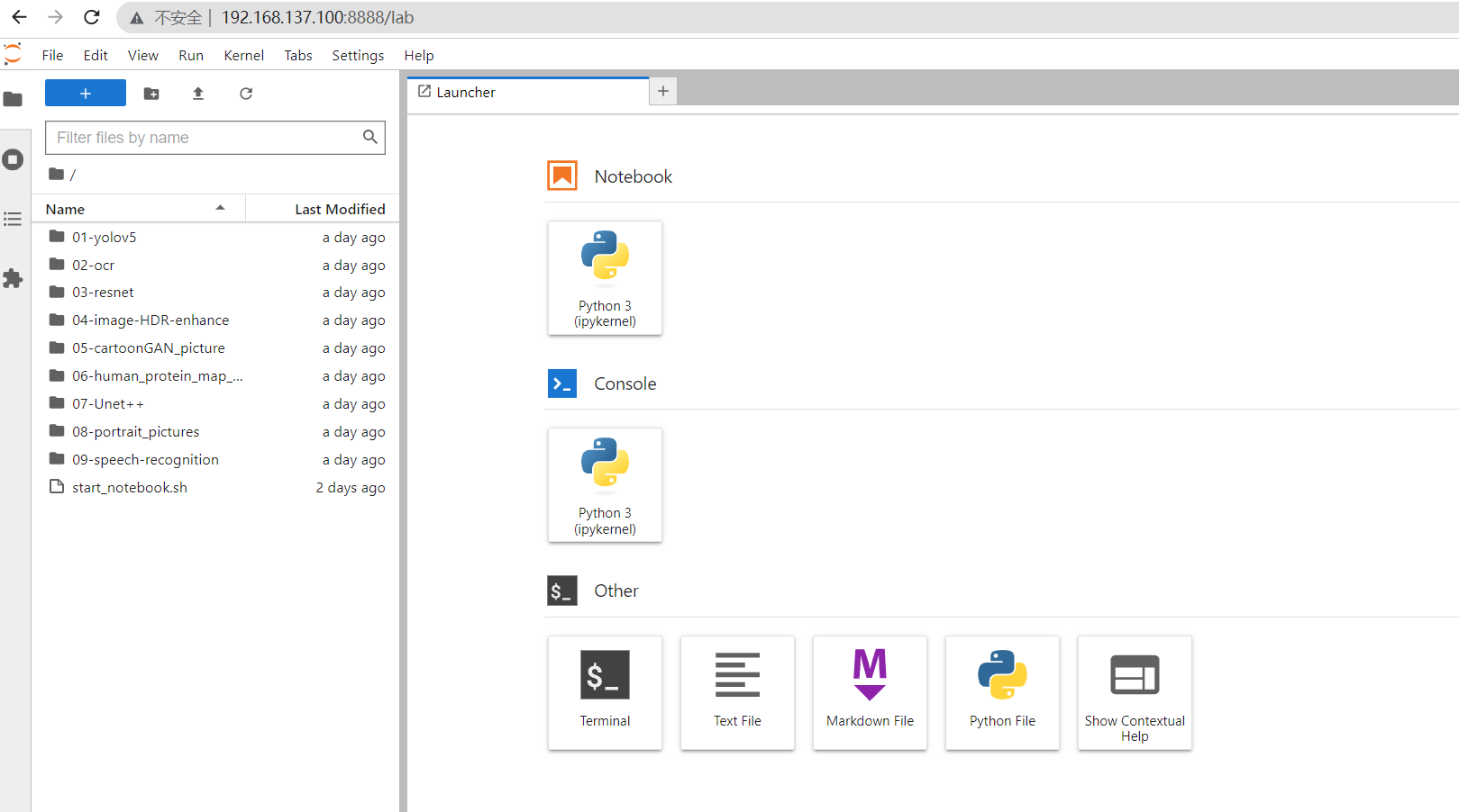 复制终端上的地址:http://192.168.137.100:8888/lab?token=db3d13f18d3e5f2f579da253ef3771ab39b6d4465838c106