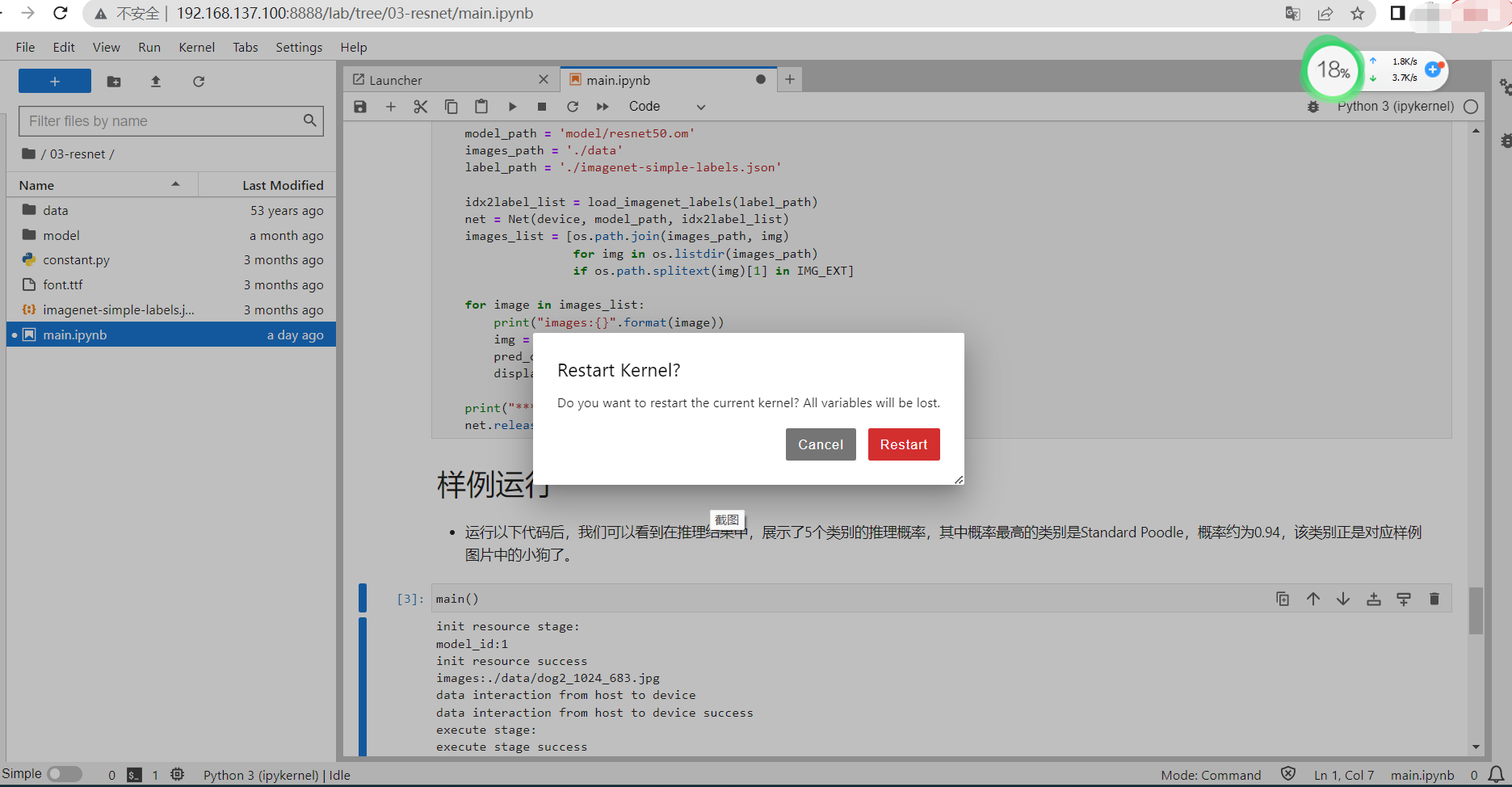 会进入JupyterLab界面。我们分别玩一玩应用:选择03 resnet下的notebook文件: