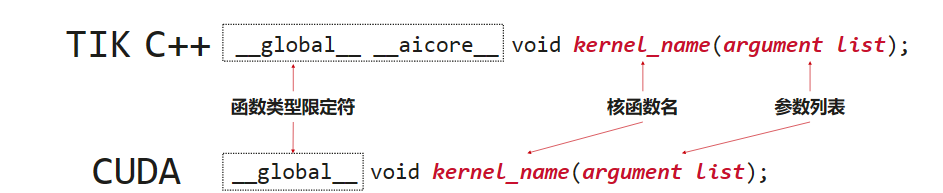 核函数(Kernel Function)是TIK C++算子设备侧的入口。TIK C++允许用户使用核函数这种C/C++函数的语法扩展来管理设备侧的运行代码,用户在核函数中实现算子逻辑的编写,例如自定义算子类及其成员函数以实现该算子的所有功能。核函数是主机侧和设备侧连接的桥梁。