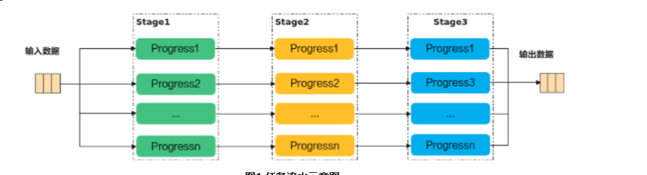 举例来说,单核处理程序的功能可以被拆分成3个流水任务:Stage1、Stage2、Stage3,每个任务专注于完成单一功能;需要处理的数据被切分成n片,使用Progress1~n表示,每个任务需要依次完成n个数据切片的处理。Stage间的箭头表达数据间的依赖关系,比如Stage1处理完Progress1之后,Stage2才能对Progress1进行处理。