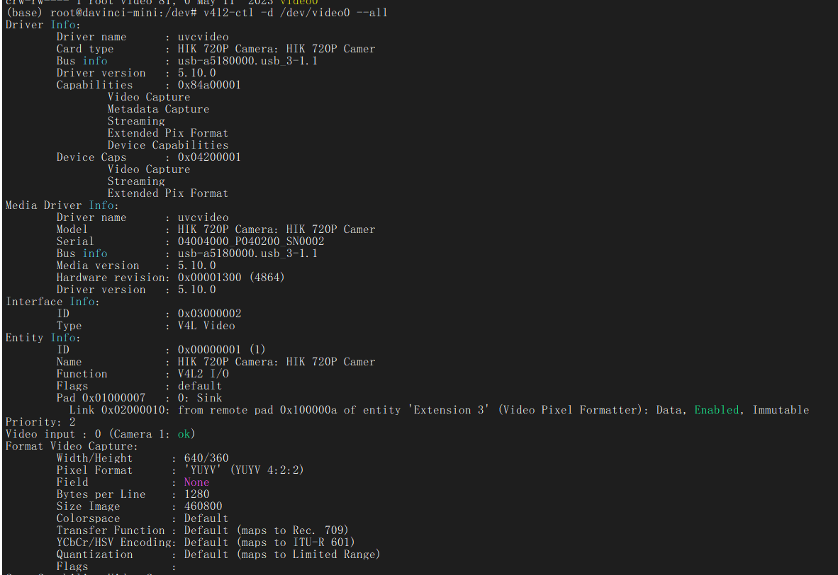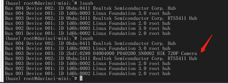 将USB摄像头插入两个USB口的一个,使用lsusb查看下:
