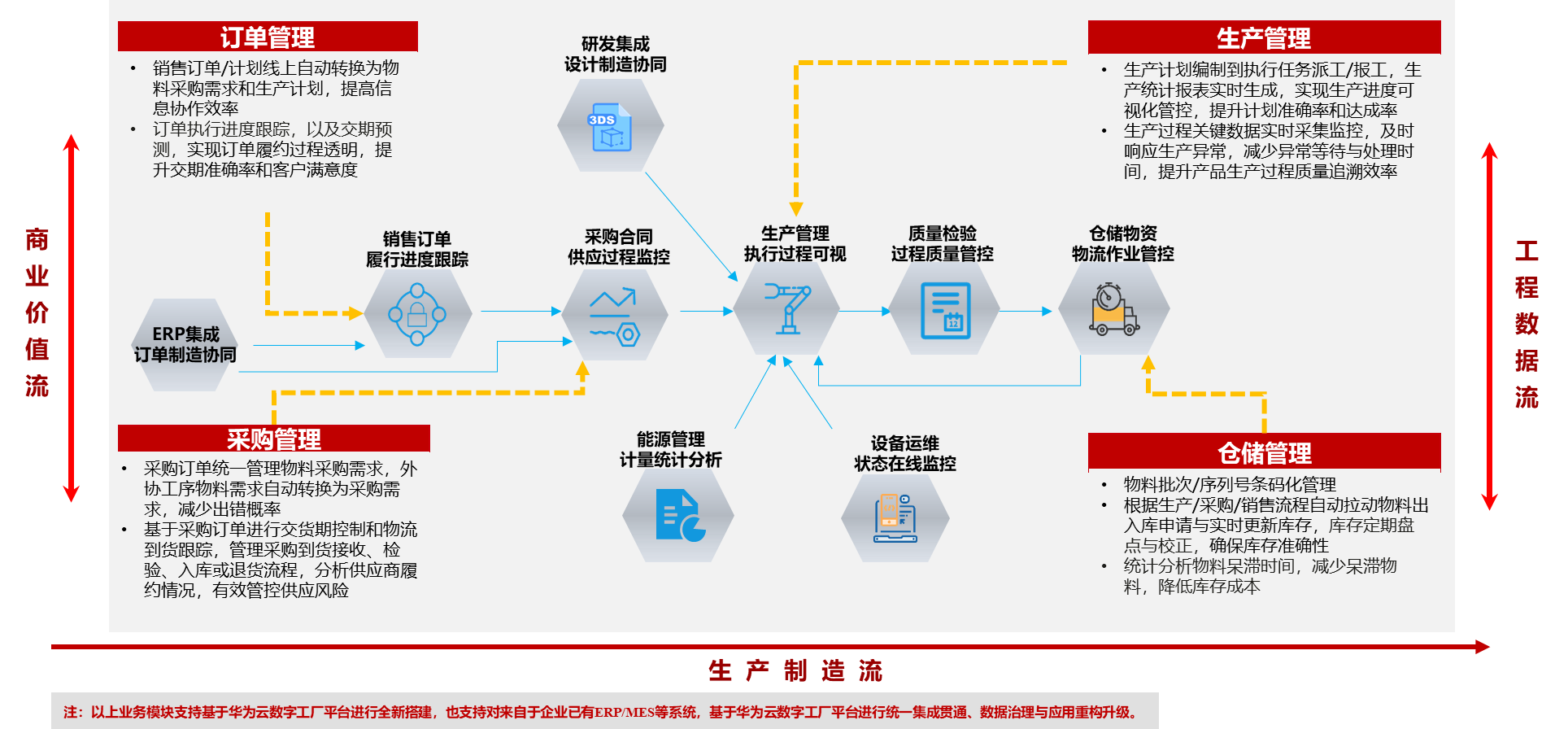 华为云数字工厂平台,预置覆盖制造全流程全场景的协同与运营类应用方案模板,帮助中小制造企业快速打通订单到生产交付的业务信息流与控制流,实现制造数字化升级: