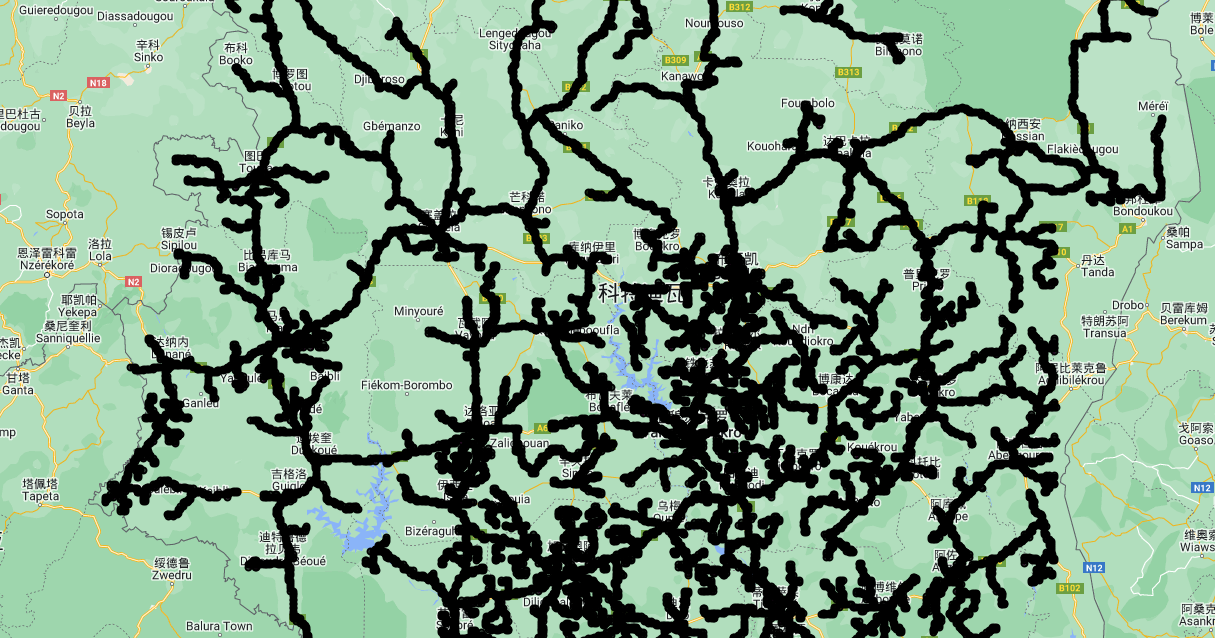 构建电网地图首先从VIIRS卫星上获取月度图像,并创建一个合成图。然后,我们应用一个定制的图像处理过滤器,以去除背景和反射光,并确定持续显示夜间照明的地点。然后,这些地点将作为电网电力存在的代理。根据energydata.info提供的数据,使用已知的电网作为模板,我们采用一种自定义的算法来连接社区,并根据它们沿着道路、避开水和遵循最短路径的可能性来推断电网的路径。你可以在这里找到模型代码和文档:https://github.com/facebookresearch/many-to-many-dijkstra