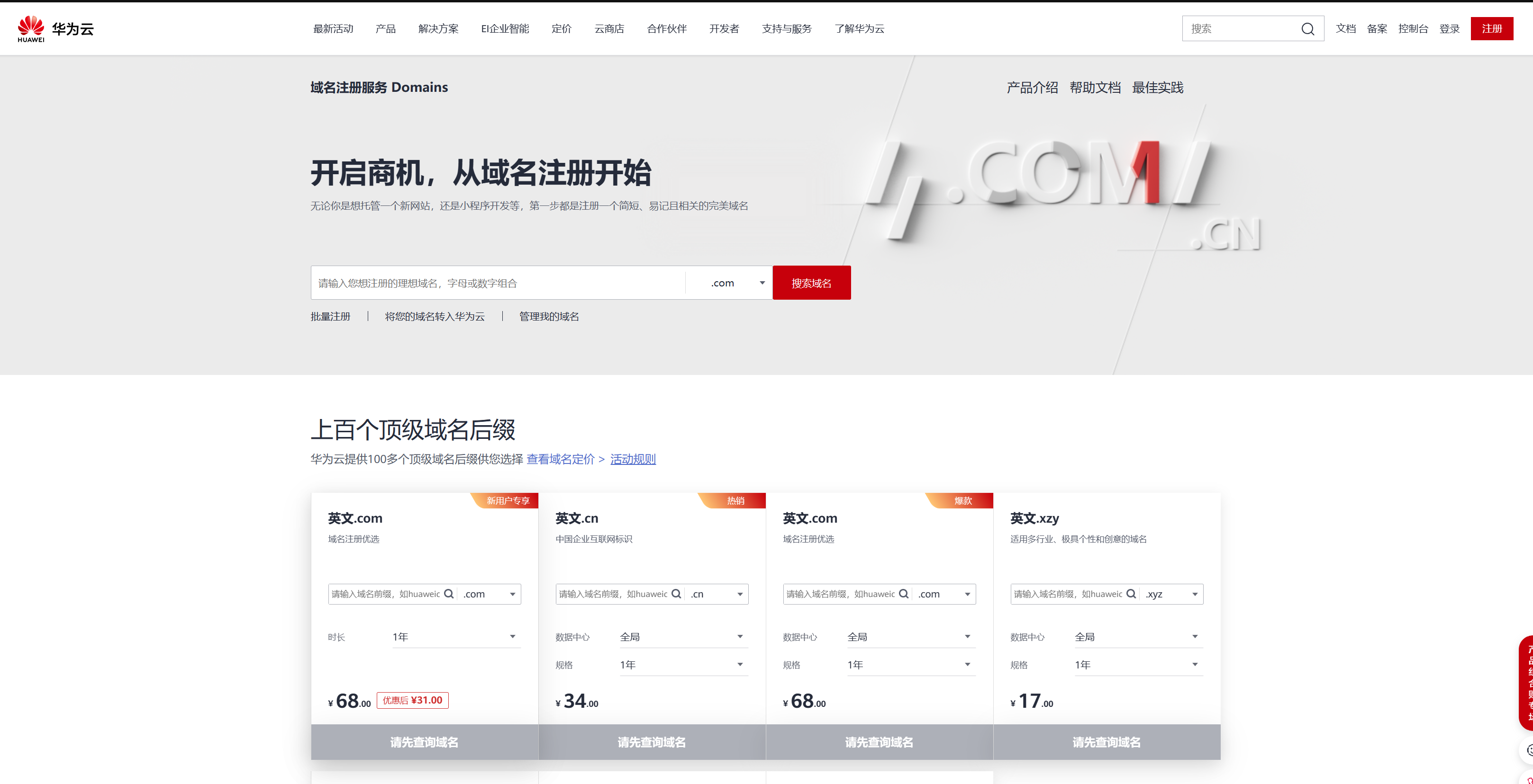 首先进入华为云官网:https://www.huaweicloud.cn/product/domain.html