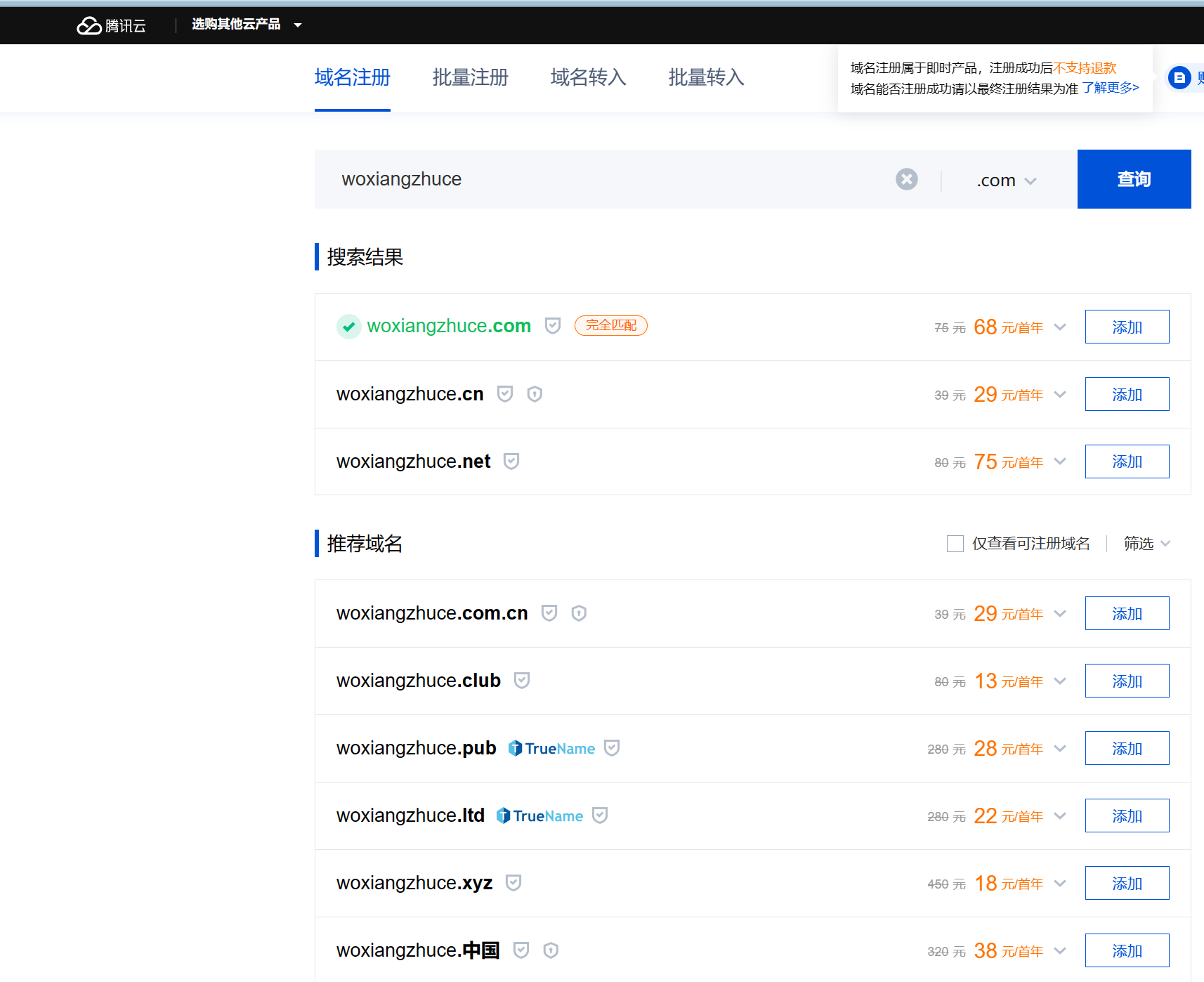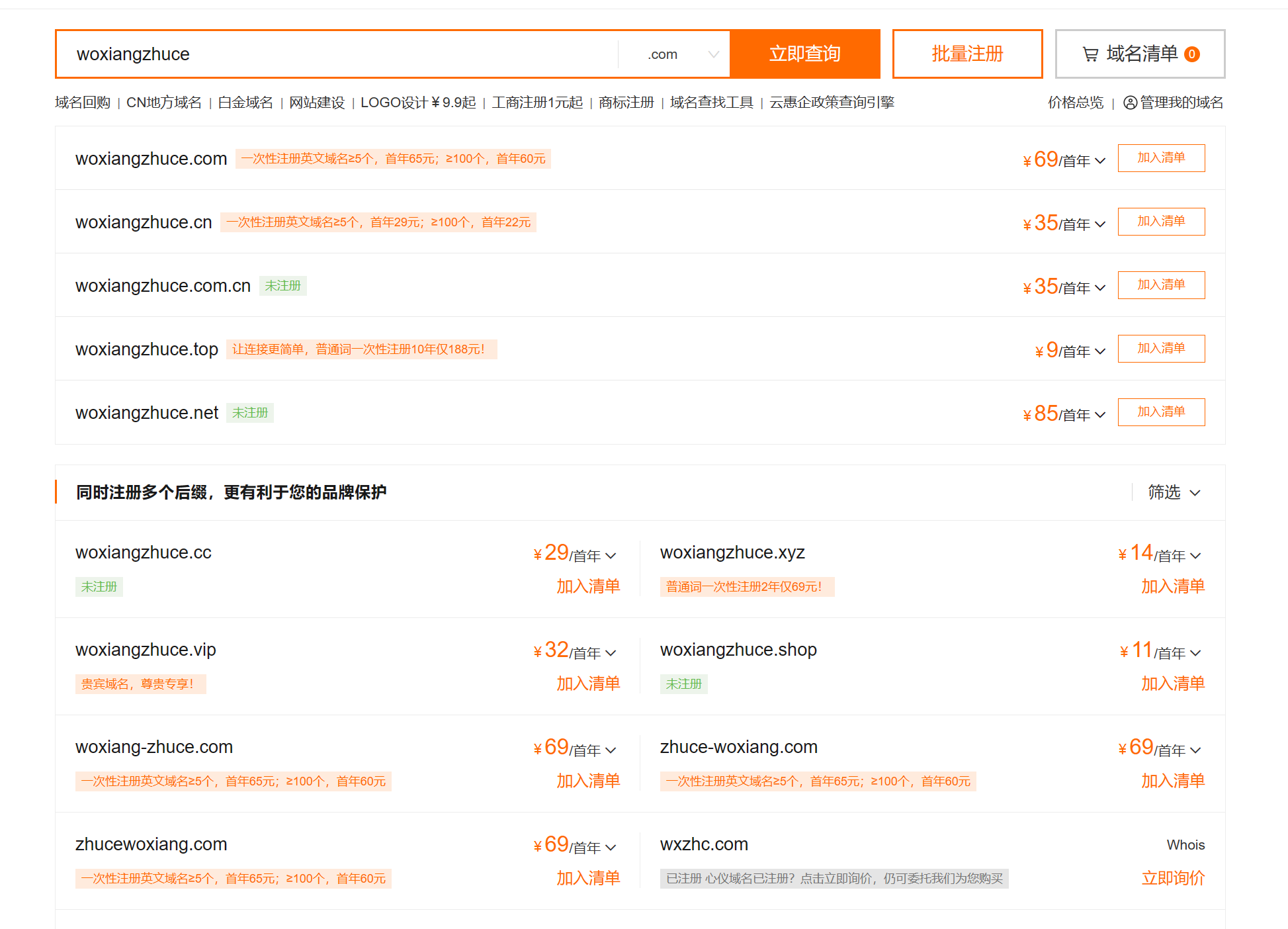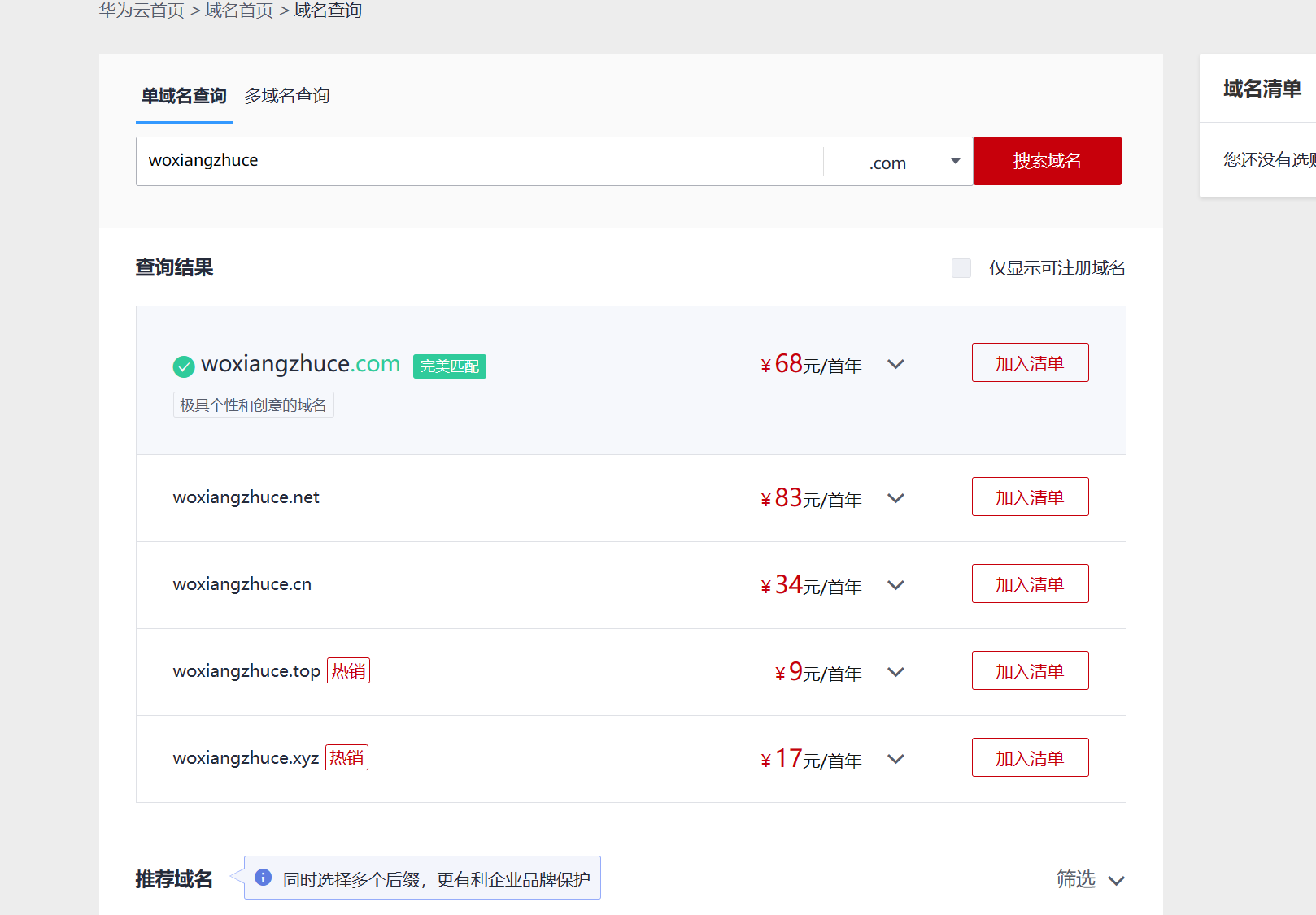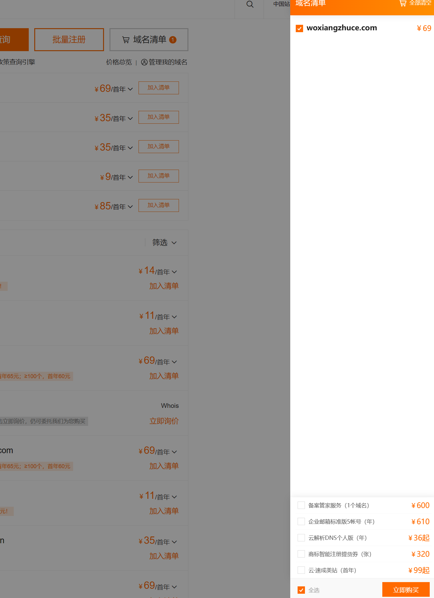 选择想要注册的域名,点击加入清单,点击立即购买