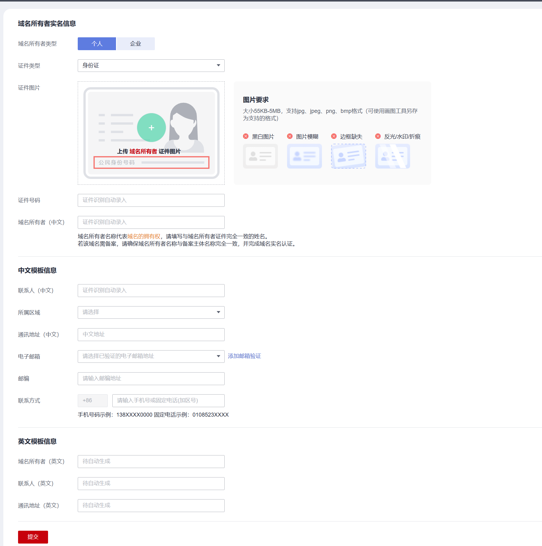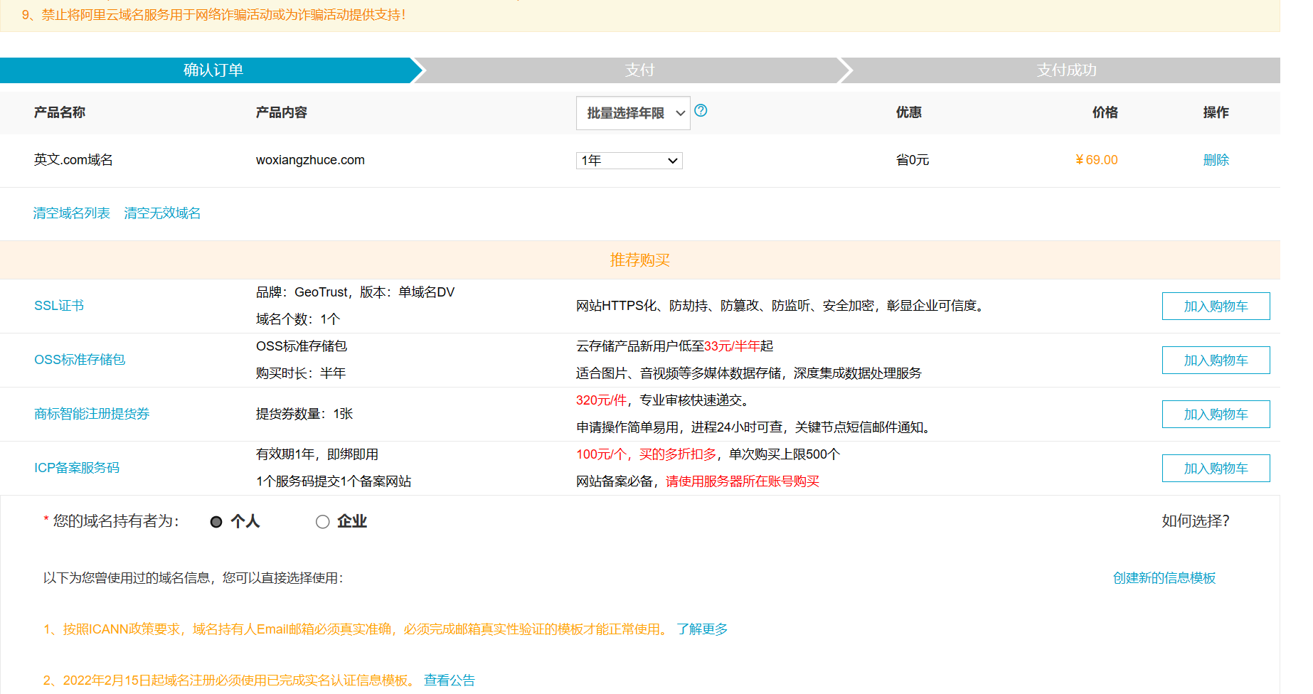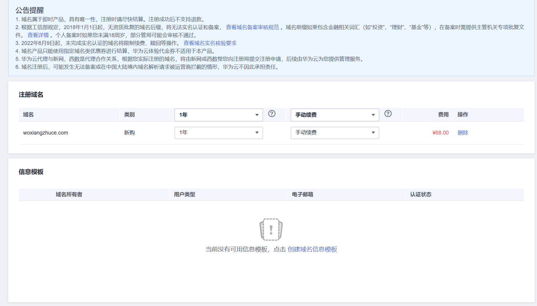 进入购买页面,选择创建域名信息模板