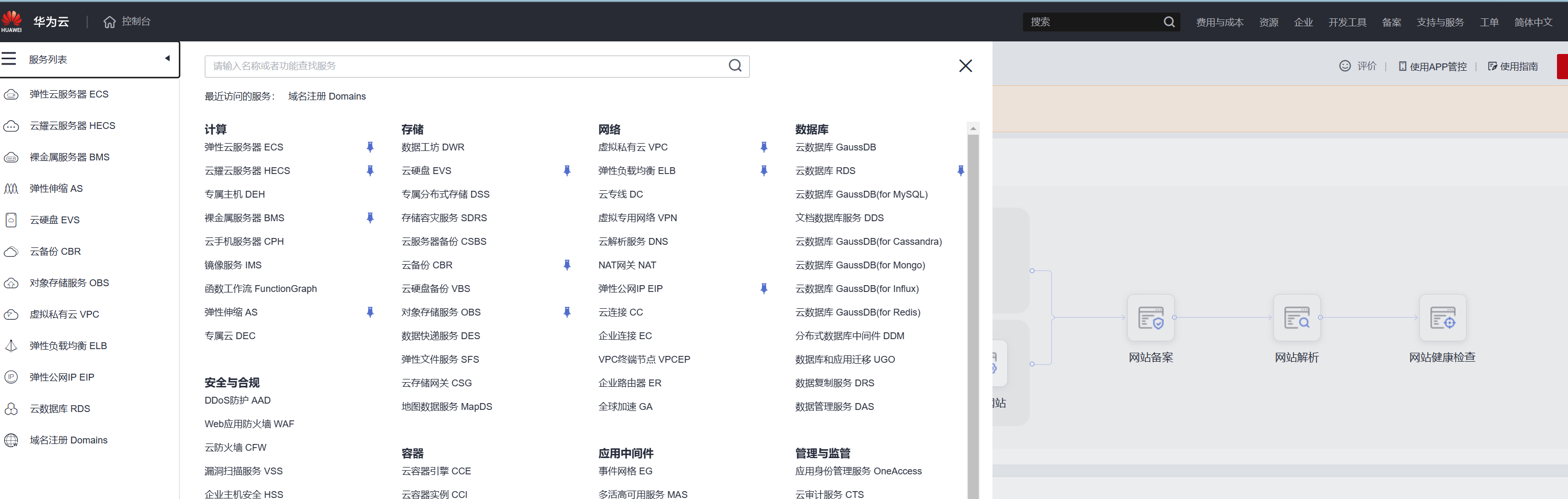 在控制台左侧三条横线那里点击,在搜索框中搜索域名