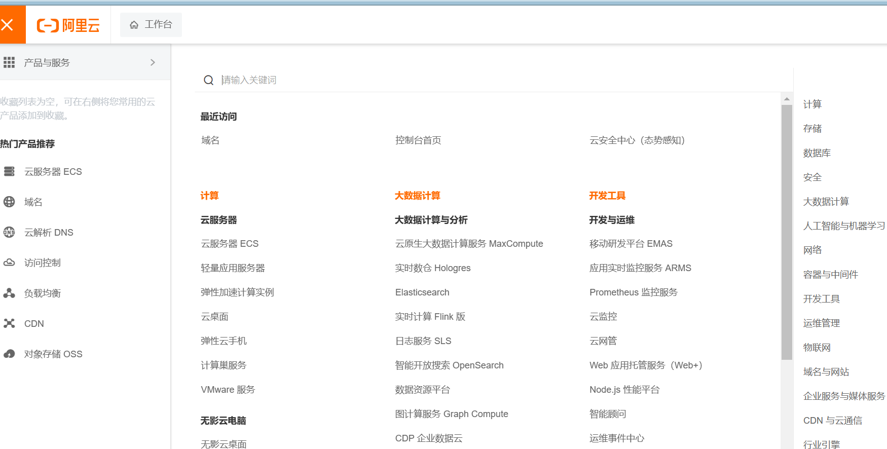 进入控制台后,点击左上角的产品与服务,在搜索框中输入域名,进入域名管理界面