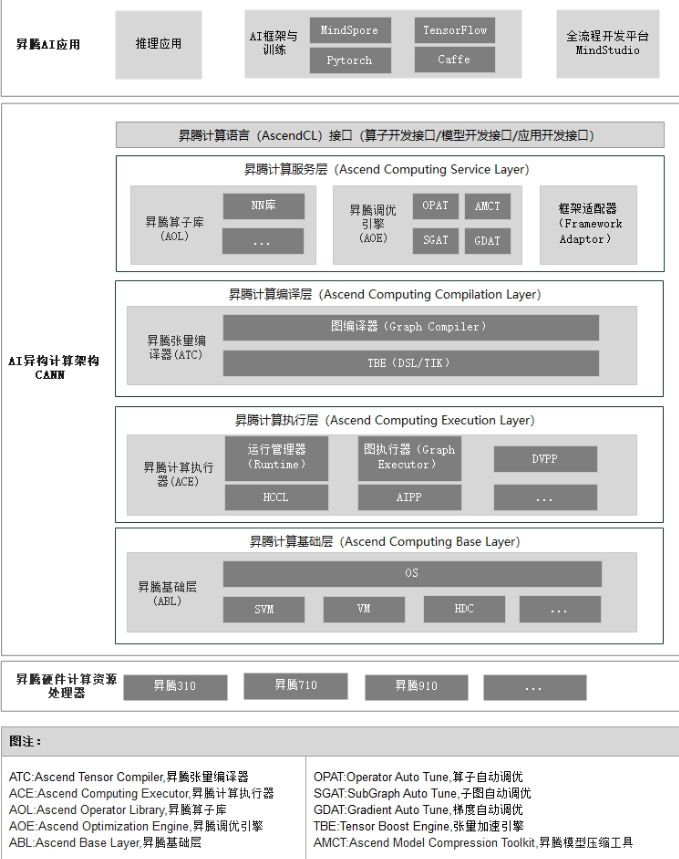 昇腾AI异构计算架构(Compute Architecture for Neural Networks,CANN)被抽象成五层架构,如下图所示。