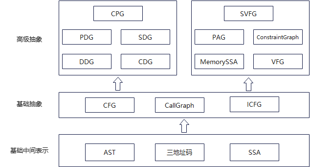 静态程序分析,就是在不执行代码的情况下,对程序进行分析。在程序分析中,根据分析的输入可以分为两种:基于源码的程序分析和基于二进制的程序分析。但是不管是基于源码还是基于二进制程序,我们都没有办法直接对他们进行分析:源码是一种文本文件,是非结构化的数据,不方便分析,而二进制则是0和1组成的数据,也不方便直接分析,因此,需要将源码和二进制程序转换成某种表示形式,方便进行分析。