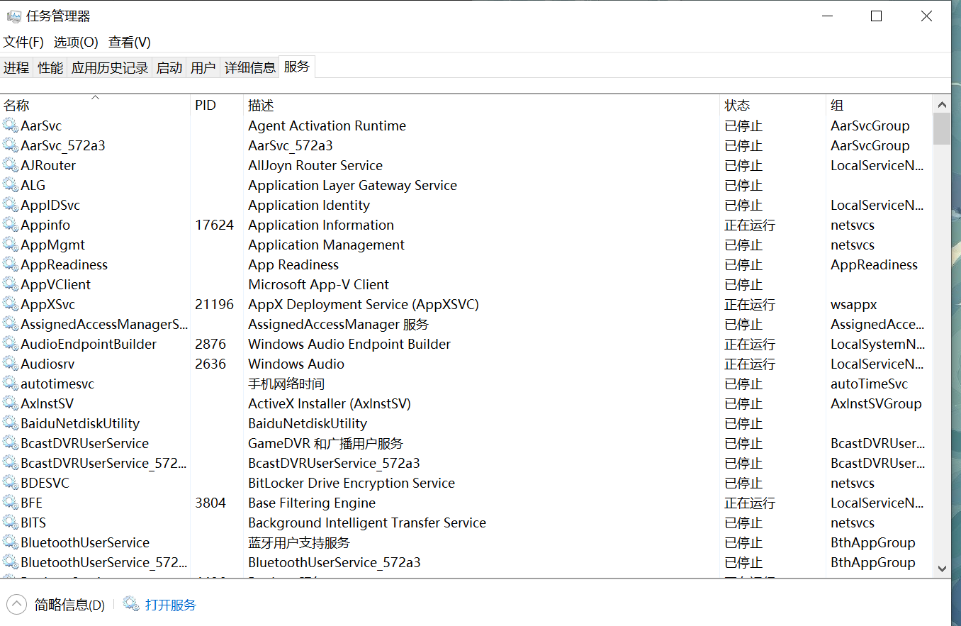 打开任务管理器,上方选择服务,进入如图的页面后,选择左下角的打开服务