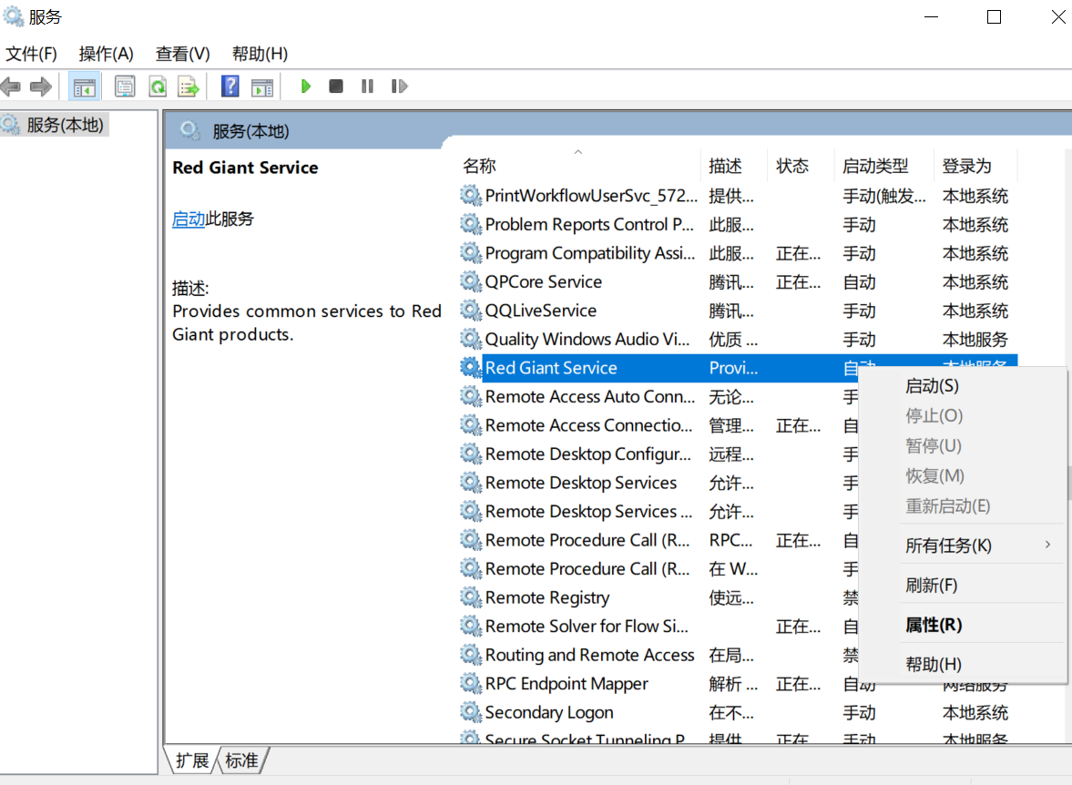 点击打开服务后,选择Red Giant Service,右键选择启动